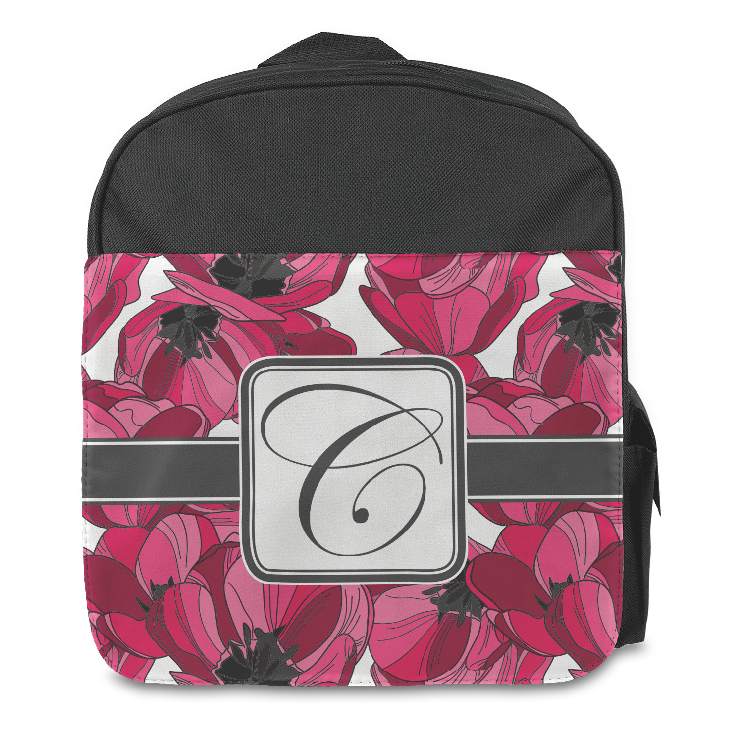 The backpack is a small size perfect for toddlers up to Kindergarten age. The zipper main pouch can hold most of their items and they have one side pocket with a flap to close it and the other side has a mesh pocket perfect for a water bottle. The outside has a customizable flap with a smaller pouch to hold more items. The straps are adjustable to fit your toddlers shoulders and they have a loop on top for hanging for storage.