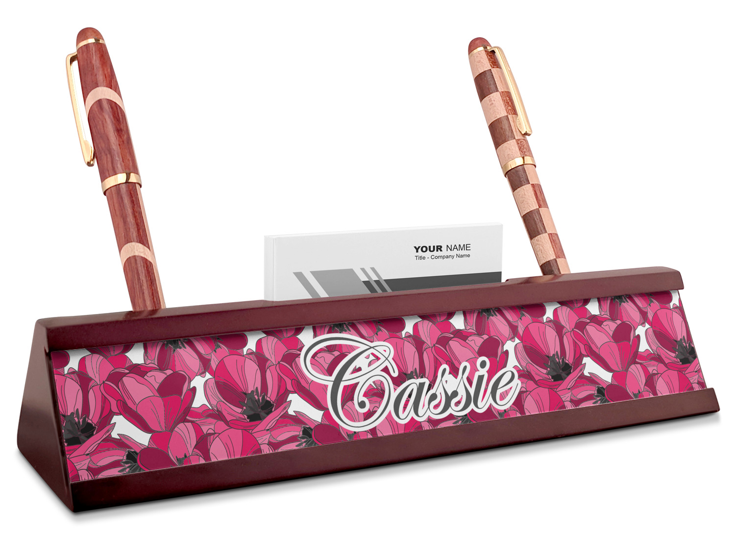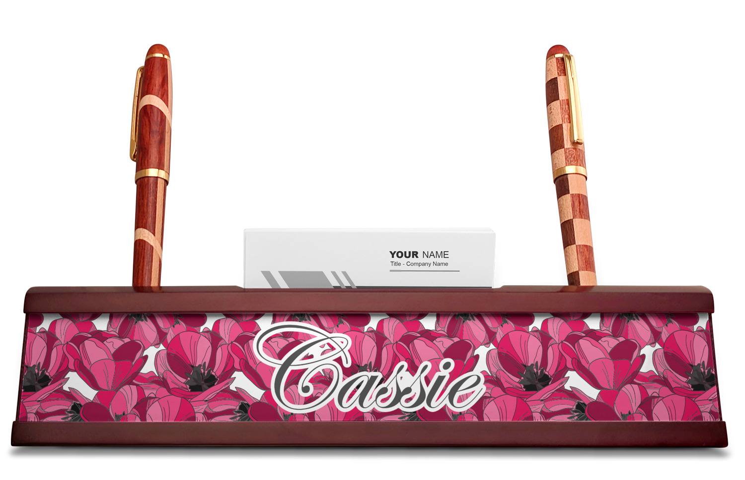 Your desk name plates are crafted from a high-quality, dark-cherry mahogany. At approximately 9.5 by 1.875 by 2.5 inches, this name plaque will fit perfectly, front and center, on your desk. Your customization spans across the entire face of the nameplate. Behind the nameplate lies a skinny slot that can fit approximately 15, traditionally-sized, business cards. You can also store your writing utensils on either side of this custom desk name plate.