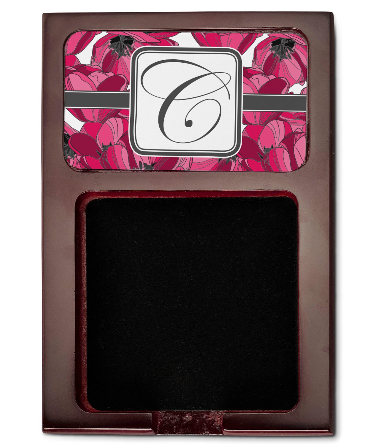 Crafted from a fine mahogany, this post it note holder is in the shade of a dark, cherry color. The dispenser itself is about 4.25 by 6.25 by 0.75 inches. You can place your 3 by 3 inch sticky notes in the indentation below the nameplate. We print your customization onto the nameplate that rests above the velvety indentation.