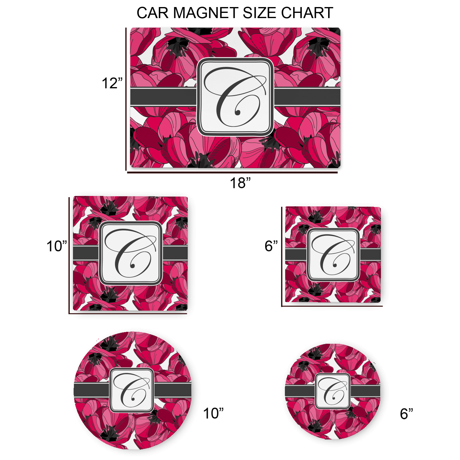 Your personalized car magnets are available for purchase in two shapes and two sizes. We carry round and square editions; each shape can either be 6 by 6 inches, or 10 by 10 inches, depending on your needs. Both versions are 1 millimeter thick, which is considered, within the industry, as the ideal thickness for automobile magnets. The magnetic car decals will adhere to any smooth, metal surface of your cars body, such as the trunk door or a side panel. However, please note that some vehicles are constructed from fiberglass bodies, which prevents the adhesion of anything magnetic. We advise that you test your vehicle before purchasing these magnets.
