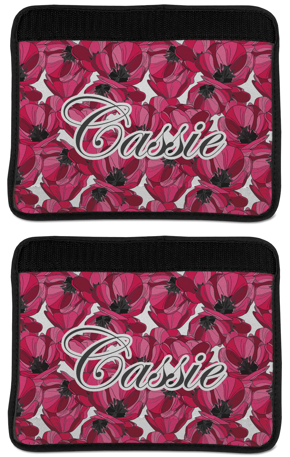 Made from neoprene, our seat belt strap covers wrap around the belt itself and have a Velcro tab for easy attachment and closure. The belt's edges are trimmed with a black polyester for a secure finish. Each cover is 9.5 by 7 inches when open and 9.5 by 2.5 inches when closed. We print your personalized design on the face of the seat belt pad.
