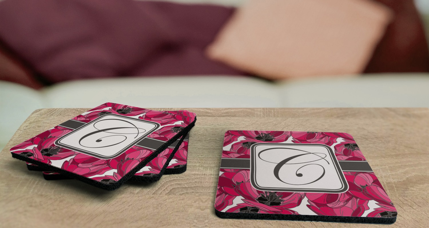These drink coasters have a smooth, polyester top and a textured, rubber backing on its bottom. The non-slip rubber backing underneath works to keep any spills at bay. At 4 by 4 by 0.25 inches thick, these custom coasters are a suitable size for most drinkware. Your personalization is displayed atop the face of the cup coaster. We sell these rubber coasters in two different shapes: square and round. You can buy each shape as singulars or as a set of 4.