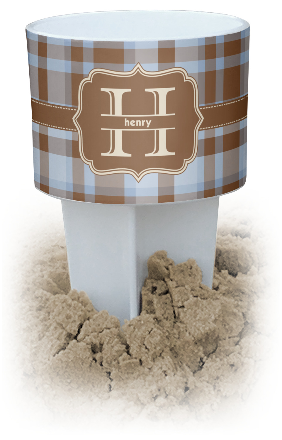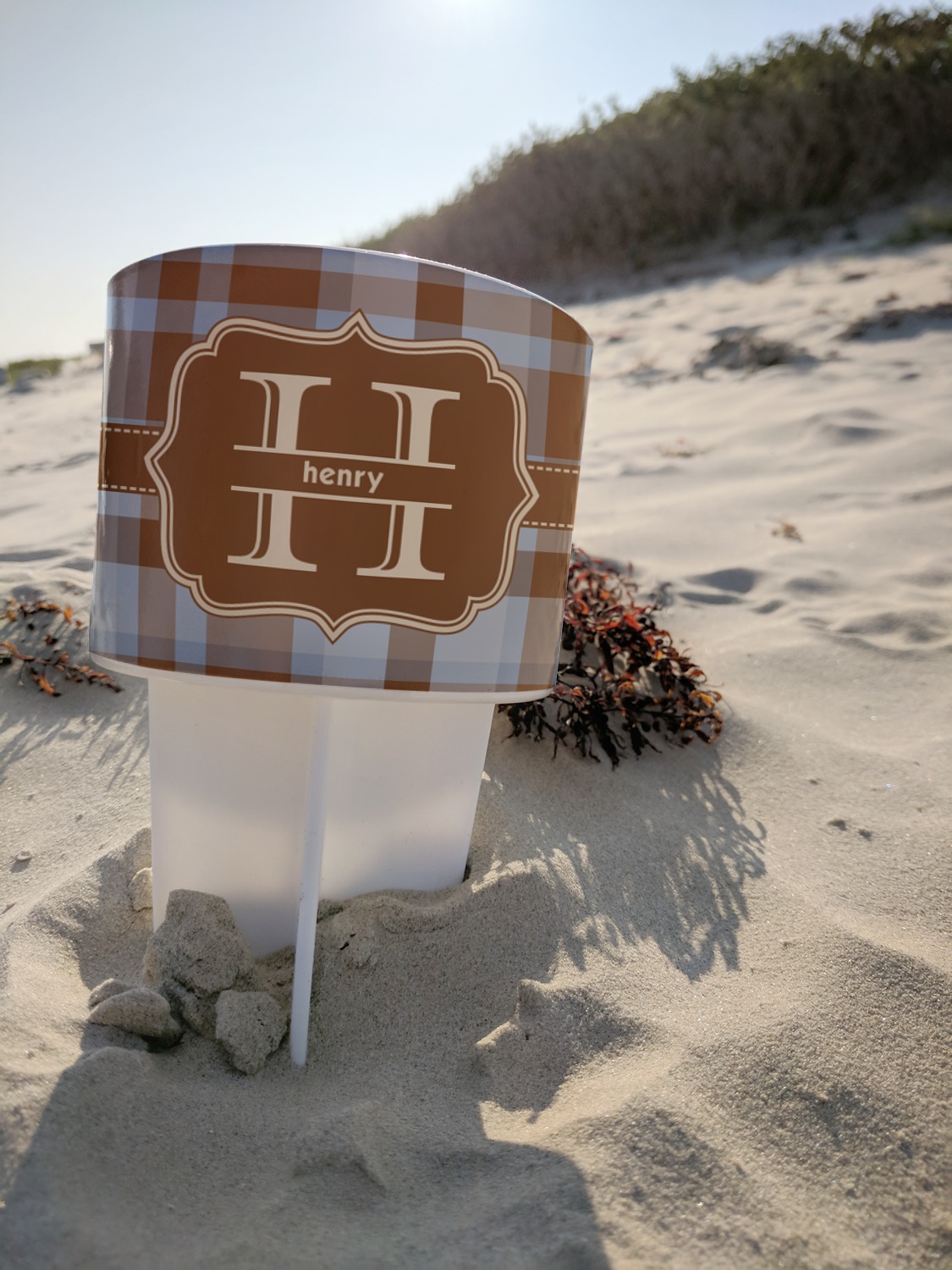 This cup holder has a large stake at its bottom that anchors it to the sand or ground below, while the cup holder rests above the stake. The entire drink holder is made of durable plastic and displays your customization around the cup holder portion. We sell these personalized beach spikers in two different colors: black and white.