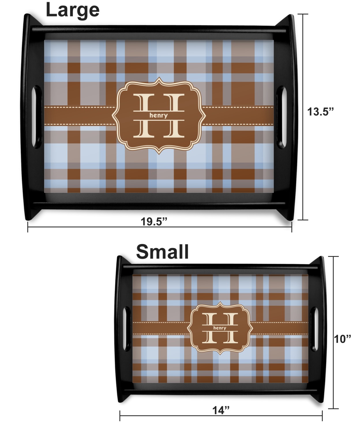 This serving tray with handles features square edges and two rounded sides, creating a very modern look. Each side is fabricated from a beautifully cut, natural wood. The bottom of the interior of the tray displays your customized design in bright, vibrant color. The tray is sold in both a black color and a natural wood look. Each variation of the wood serving tray has two sizes: Small, which is 14" x 10" x 2.25", and Large, which is 19.5" x 13.5" x 2.75".