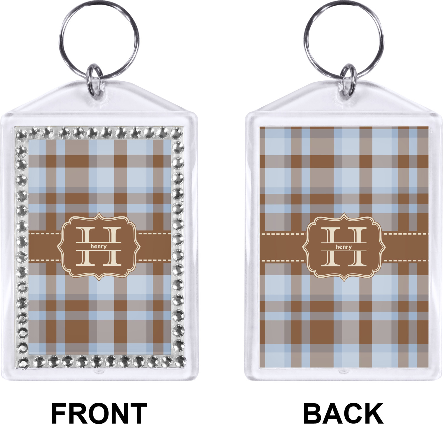 Our personalized keychains have a bold, rectangular shape, outlined by a series of shimmering rhinestones. A metal, split keyring is included with your purchase, and an additional metal hoop allows for attachment of the keychain to the split ring. This unique keychain measures at about 3.75 by 2.5 inches. We print your customized design(s) across both the back and front of this keychain.
