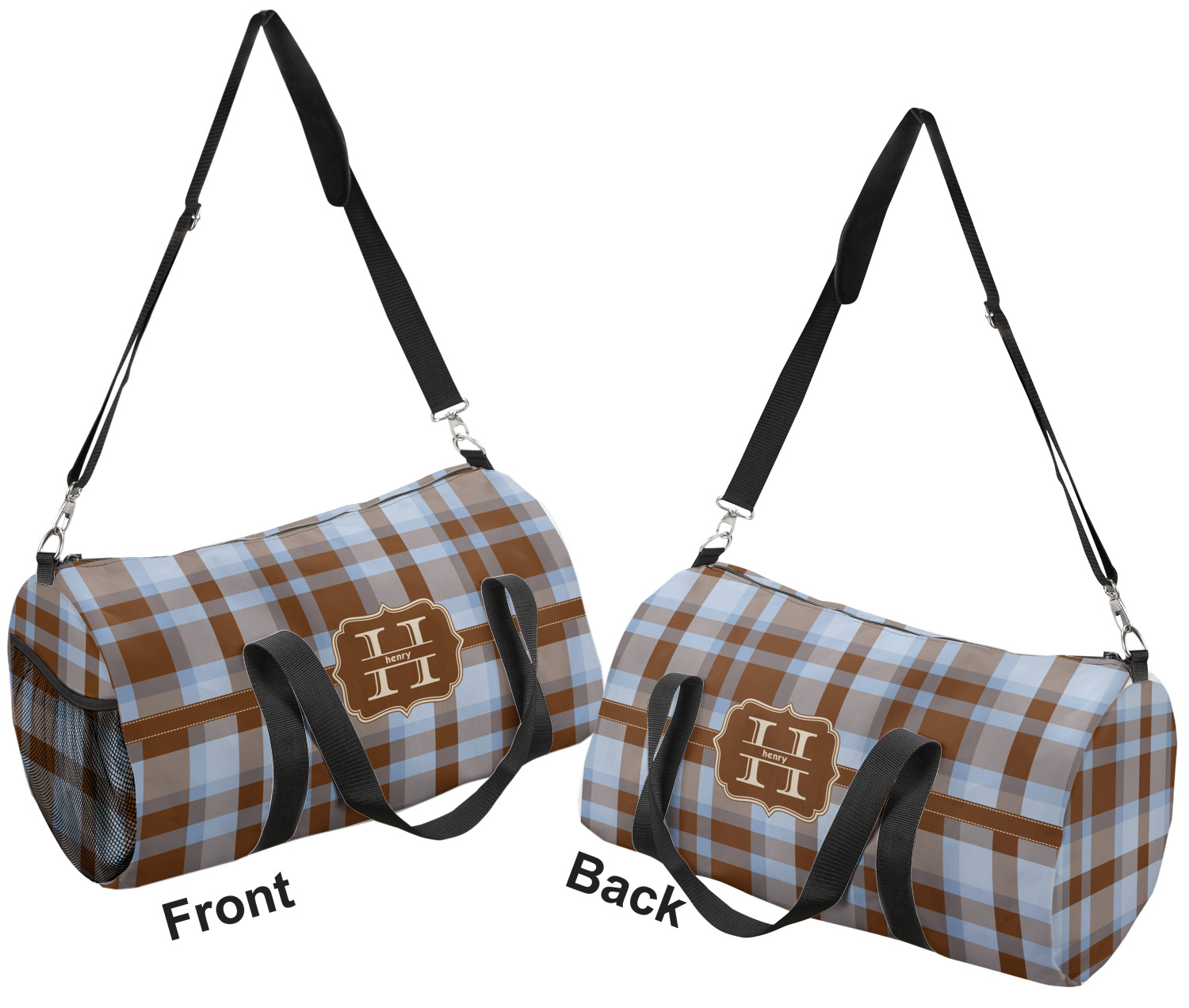 This duffle is a sturdy bag made of a canvas material. It comes in two sizes: Small (19"W x 9.5"H x 9.5"D) and Large (23"W x 12"H x 12"D). The bag is a cylindrical shape with a black adjustable strap and two handles. On one side is an elastic pouch to put a waterbottle or other small item. Your product will be sublimated with your design and is able to be designed on the front, back, and sides. Be sure to remember that the straps may cut into parts of your design if you upload your own artwork.