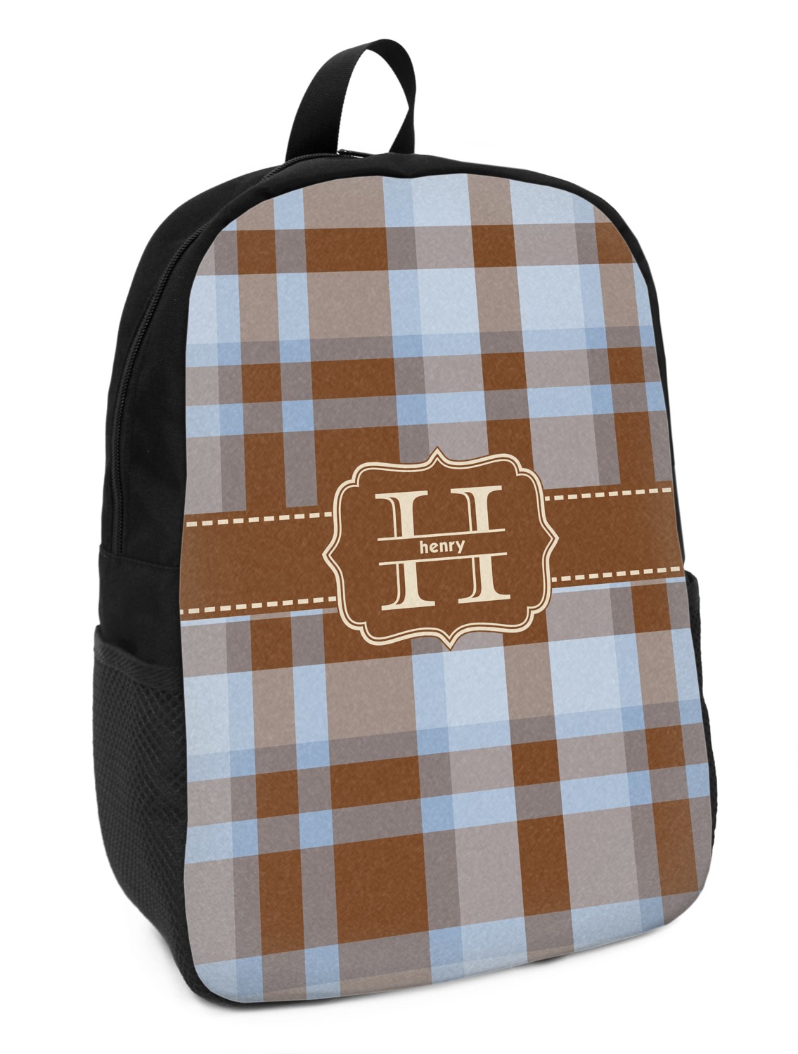 These small backpacks are made of a durable black canvas material with your personalization right on the front. The two shoulder straps are padded and easily adjustable. The bag itself measures at about 11" W x 15" H x 5" D. It's the perfect size for elementary aged kids or adults who want a smaller backpack. On the top of the bag you will find a handle to hang or carry your backpack by as well as a large zipper closure to keep all of your belongings safe inside. On each side of your backpack is a mesh pocket for a small item or water bottle. Inside your backpack you will find a spacious area with a small zipper pocket and a padded laptop slot that will fit up to a 13" laptop (13" being very snug). This is the perfect bag for any student that needs a couple books and their laptop with them at all times. It also works great as a carry on for traveling!