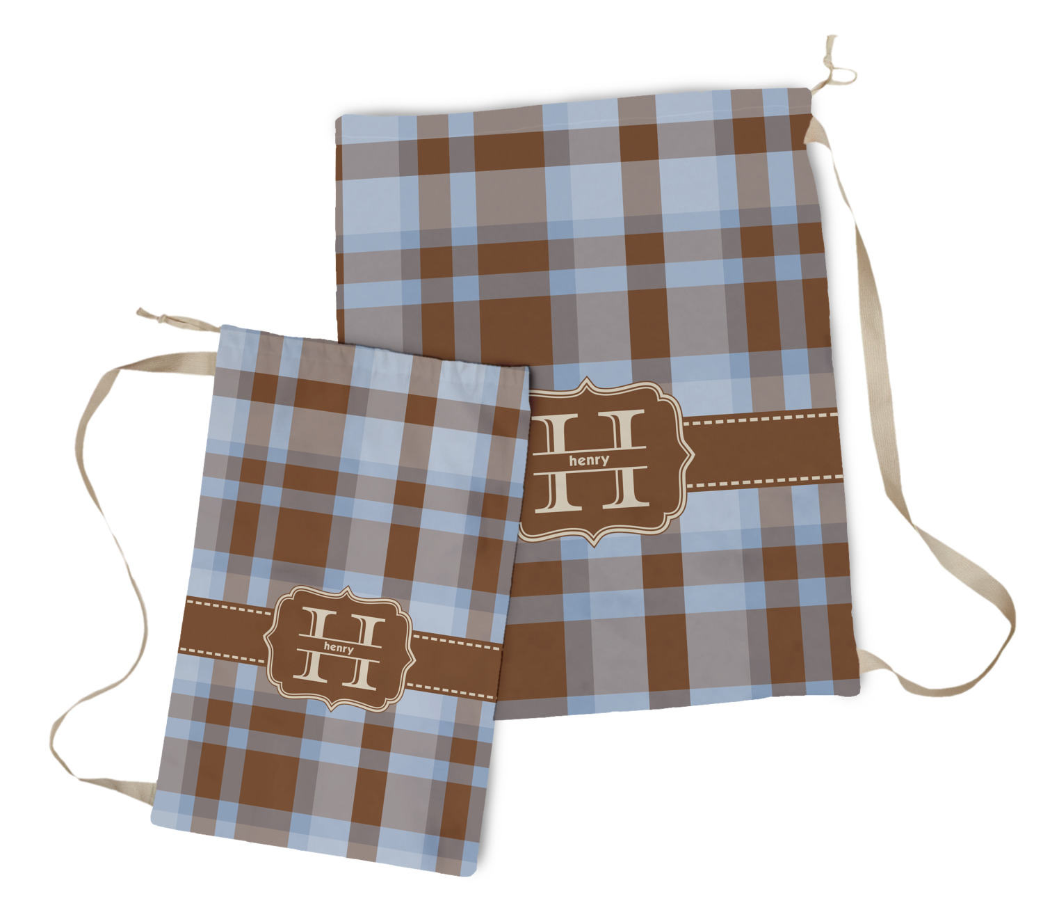 Carry your laundry in style with these customized laundry bags. Available in two sizes, featuring a natural colored woven strap and a cinch cord, these bags hold a lot of clothes or anything else you want to fit in them.