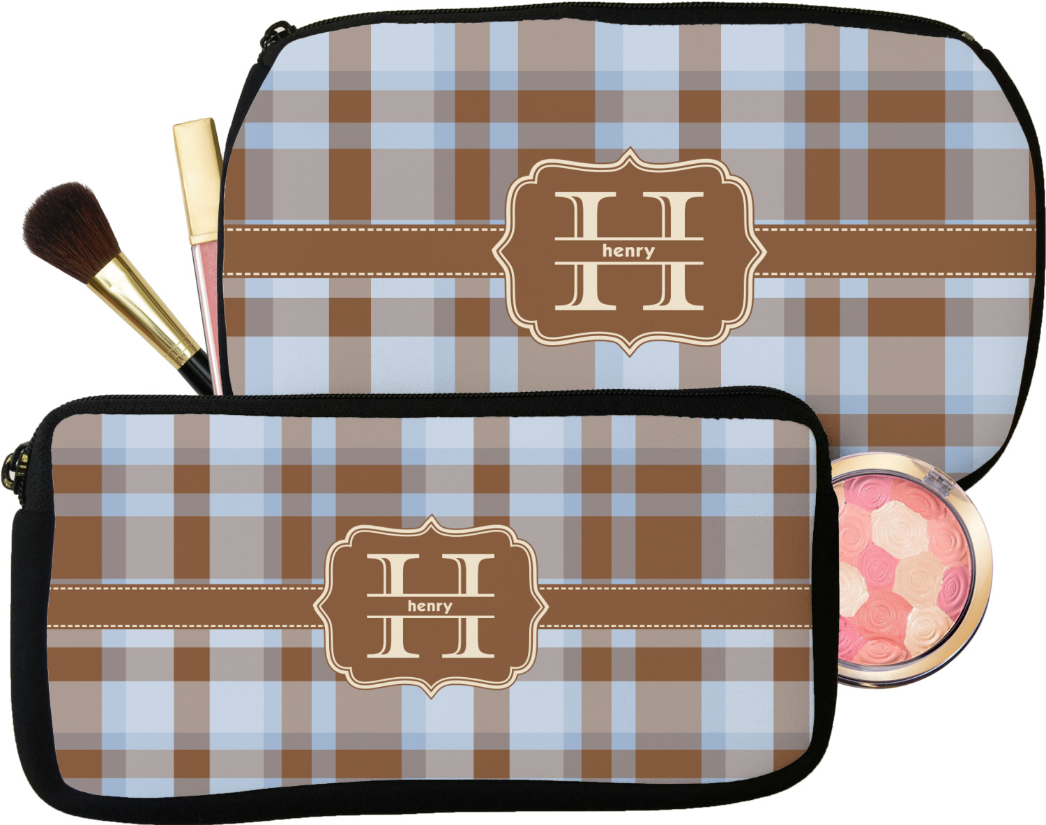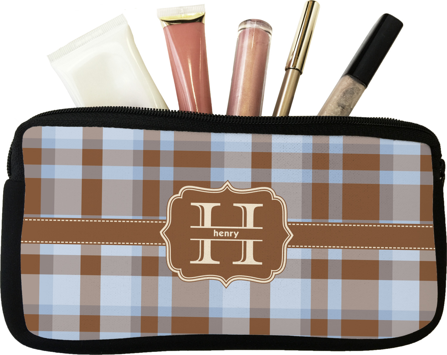 Our personalized makeup bags are available in many different designs, patterns and colors - so you are sure to find one that will love. They are made of neoprene (same material as wet-suits) and thus are water resistant, so spillages in your makeup bag will not end up all over you purse. They are customized on one side and are black on the other side and the zipper is black as well.