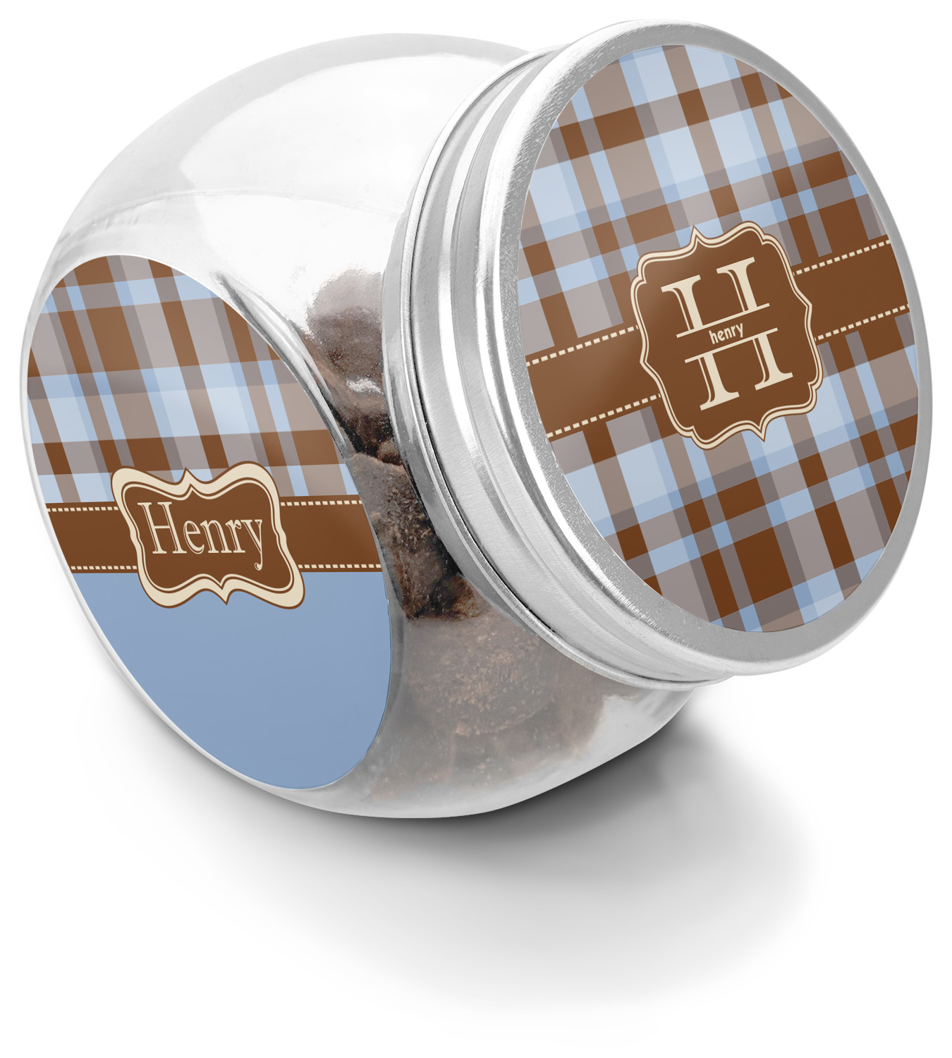 This treat jar is an excellent way to store treats for your favorite canine or feline. Moreover, their delicate, classy appearance makes them a tasteful addition to your countertop's décor. Crafted from clear glass, its unique construction and silver metal, screw-on lid allows for quick and easy access. Three, permanent, vinyl stickers are applied to both sides of the jar and lid, presenting your personalized design. The base of this glass, dog treat jar is 3.4" x 4.75", and the jar stands at 5" tall. Though on the smaller side, this jar is best suited for smaller treats or training treats.