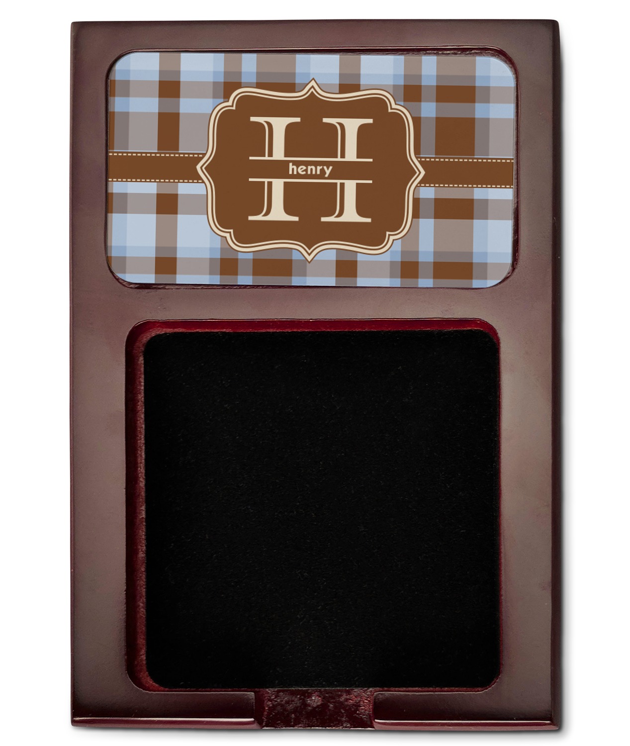 Crafted from a fine mahogany, this post it note holder is in the shade of a dark, cherry color. The dispenser itself is about 4.25 by 6.25 by 0.75 inches. You can place your 3 by 3 inch sticky notes in the indentation below the nameplate. We print your customization onto the nameplate that rests above the velvety indentation.