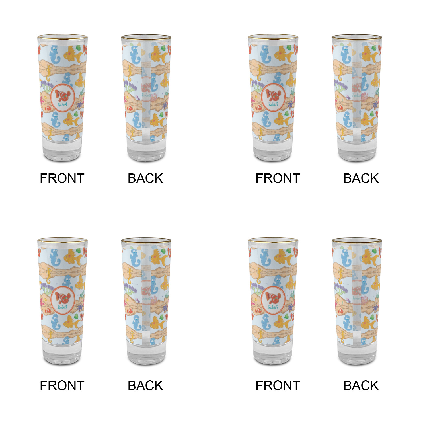 These glass shooter glasses are printed in full color with the design of your choice. These are a tall shooter 2 oz size and stand 4" tall. The print is a full wrap design to boldly display your personalization.