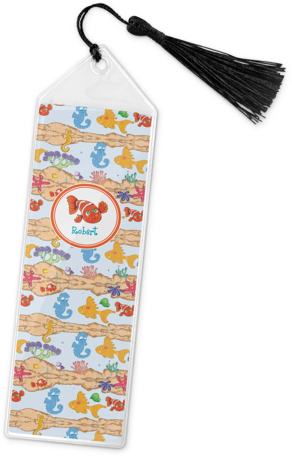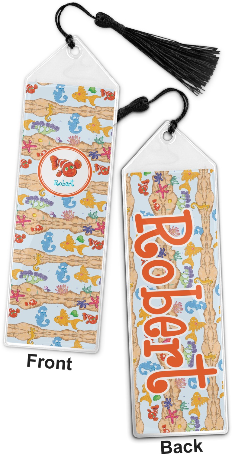 Your personalized bookmark is made of a sturdy, clear vinyl, and is approximately 7.5" x 2.25". We display your personalization on vinyl inserts that are placed on both sides. Accompanying each book marker is a black, fringe tassel that attaches to the reinforced, triangular header.