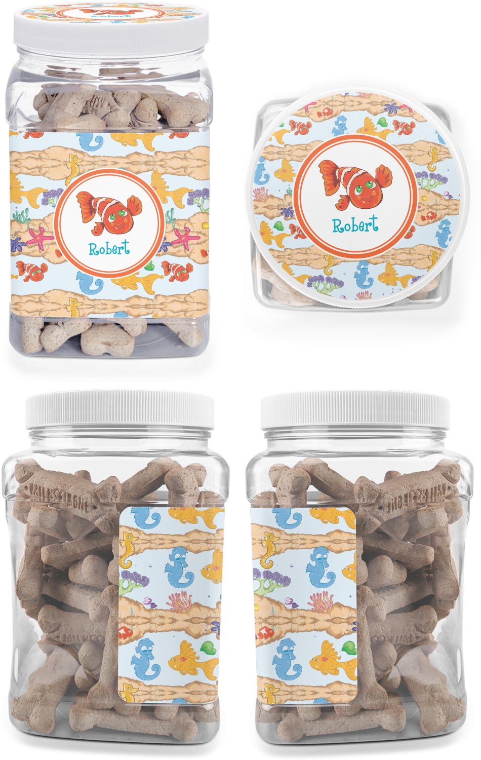 This half gallon jar, made from a sturdy plastic, is the perfect way to keep treats from any naughty pet paws, while still keeping them ready on hand for when your pup performs an impressive trick. This dog cookie jar features a screw-on, white lid that displays your personalized design on a vinyl sticker. We apply another customized sticker that wraps around the front and sides of the jar. Our dog treat jar also has indentations on the rear ends of the sides, which allows for convenient handling, and its square frame allows for easy storage.