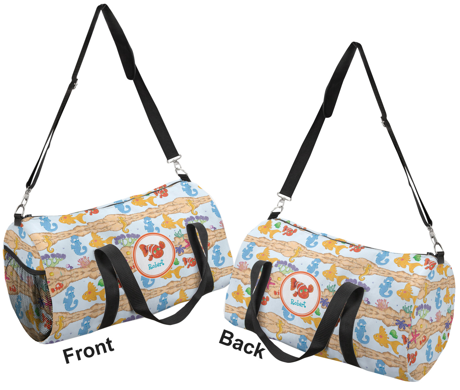 This duffle is a sturdy bag made of a canvas material. It comes in two sizes: Small (19"W x 9.5"H x 9.5"D) and Large (23"W x 12"H x 12"D). The bag is a cylindrical shape with a black adjustable strap and two handles. On one side is an elastic pouch to put a waterbottle or other small item. Your product will be sublimated with your design and is able to be designed on the front, back, and sides. Be sure to remember that the straps may cut into parts of your design if you upload your own artwork.