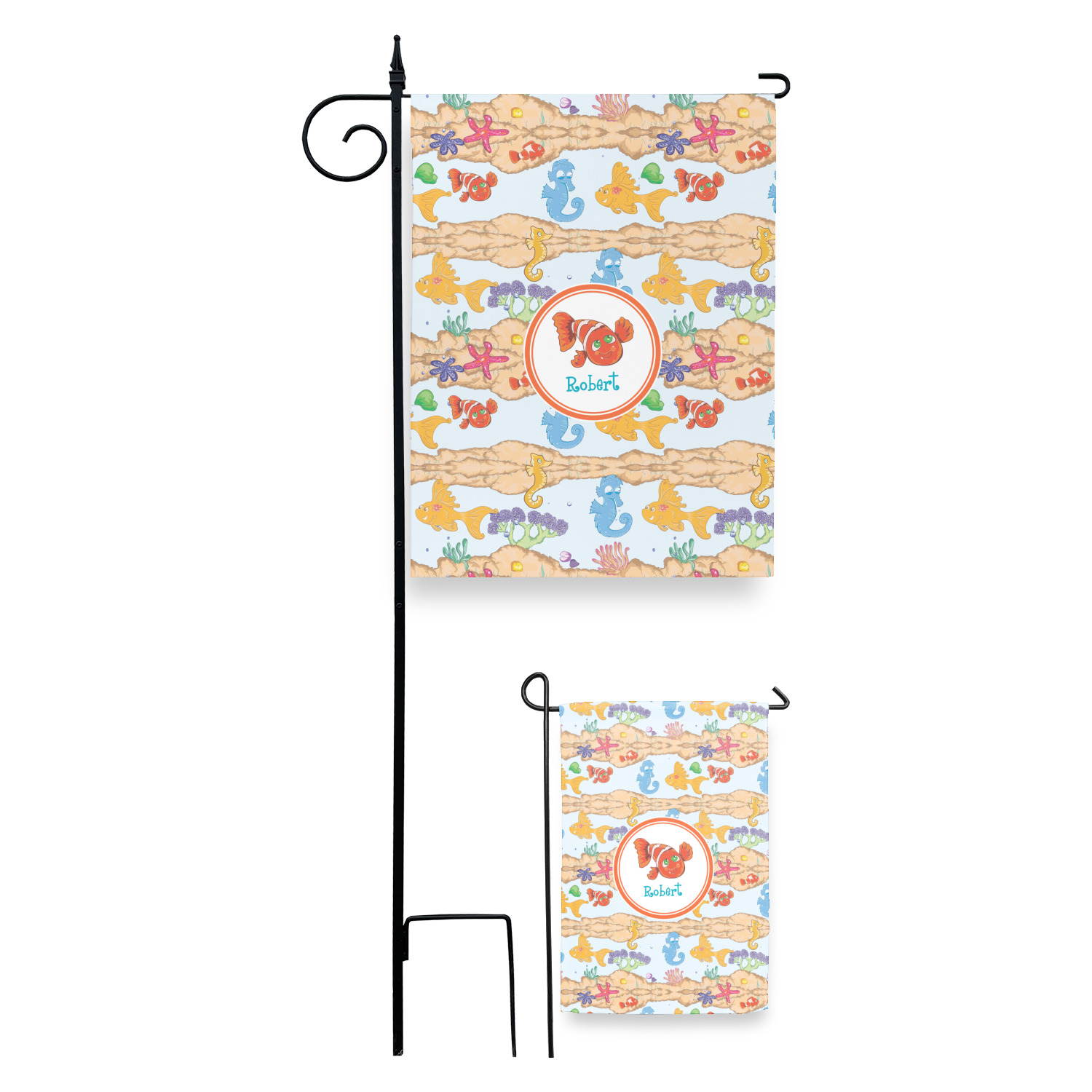 These custom garden flags are made of a durable, double-ply, polyester weave, allowing them to withstand the elements year round. The small flags measure at approximately 12 by 18 inches. The large flags measure out to 28 by 37 inches. You can order these decorative flags with your customization printed on the front only, or the front and back.