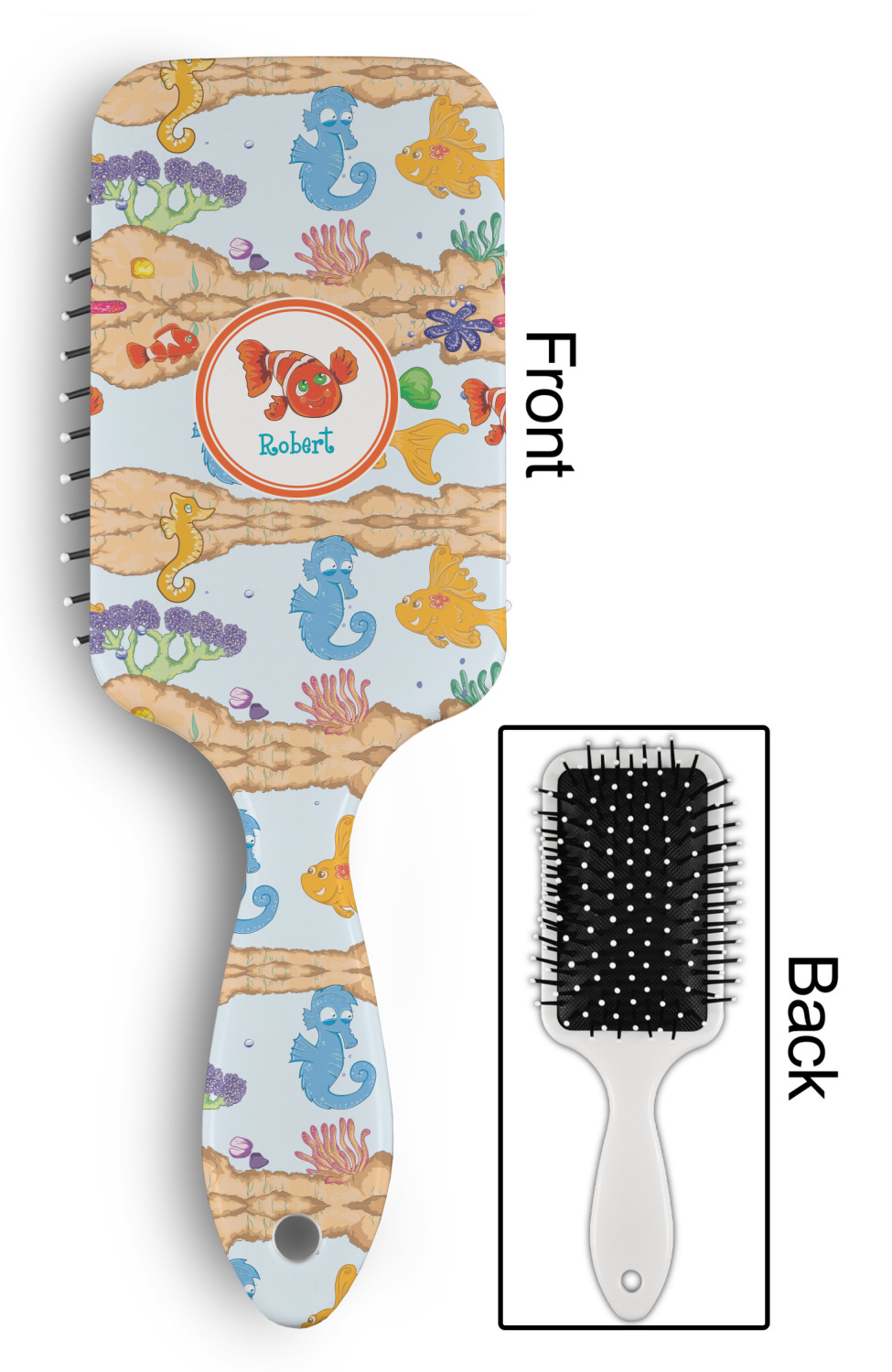 Your designed is printed on the front of the brush.; The back handle and sides are white.