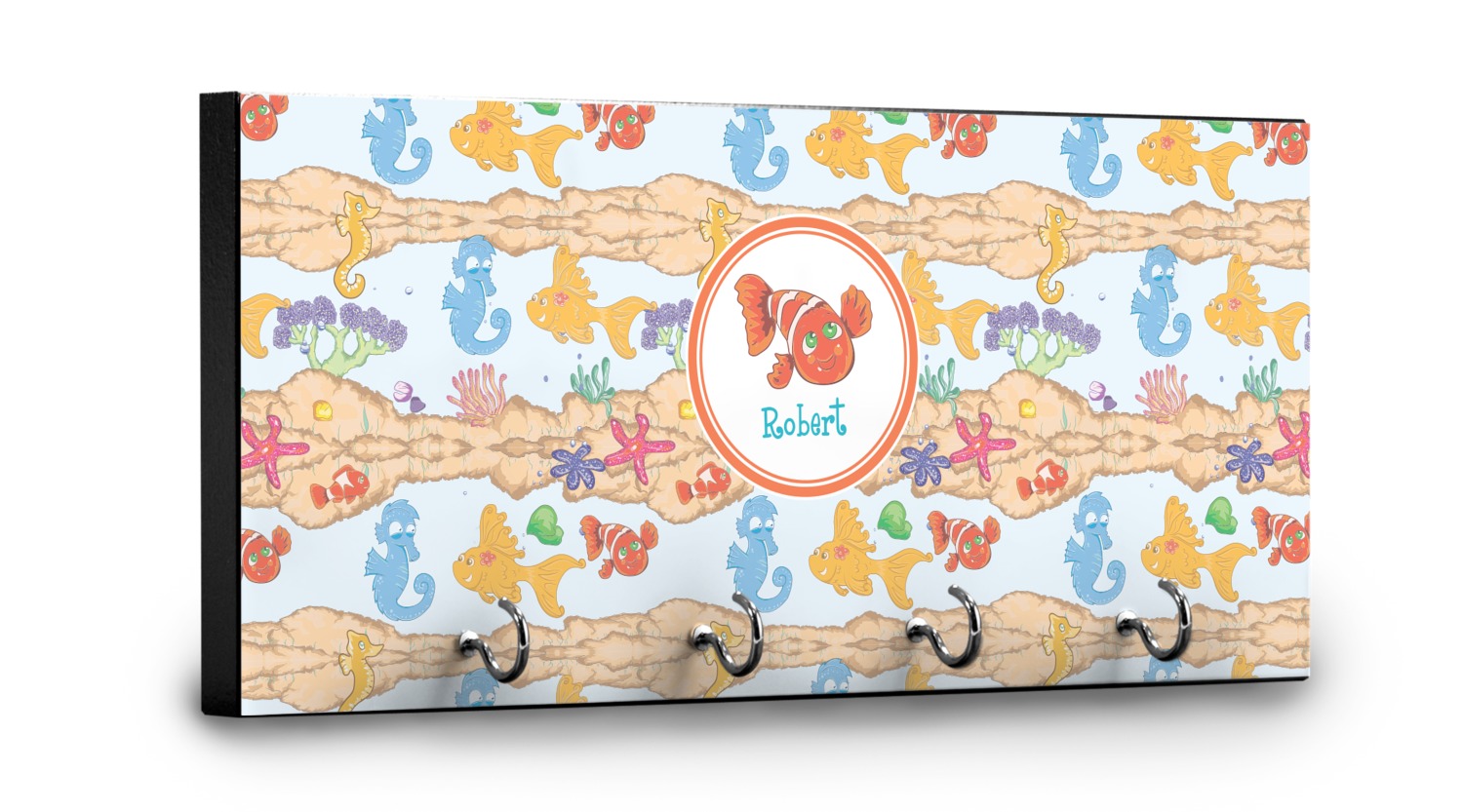 This 11" x 5" key hanger is made of sturdy wood and has four metal hooks lining the bottom. This is the perfect size for a family with several drivers. Not only can you hang keys on it though, but pet leashes and other small items. The board is black on the sides and back and is printed with the design of your choice on the front.
