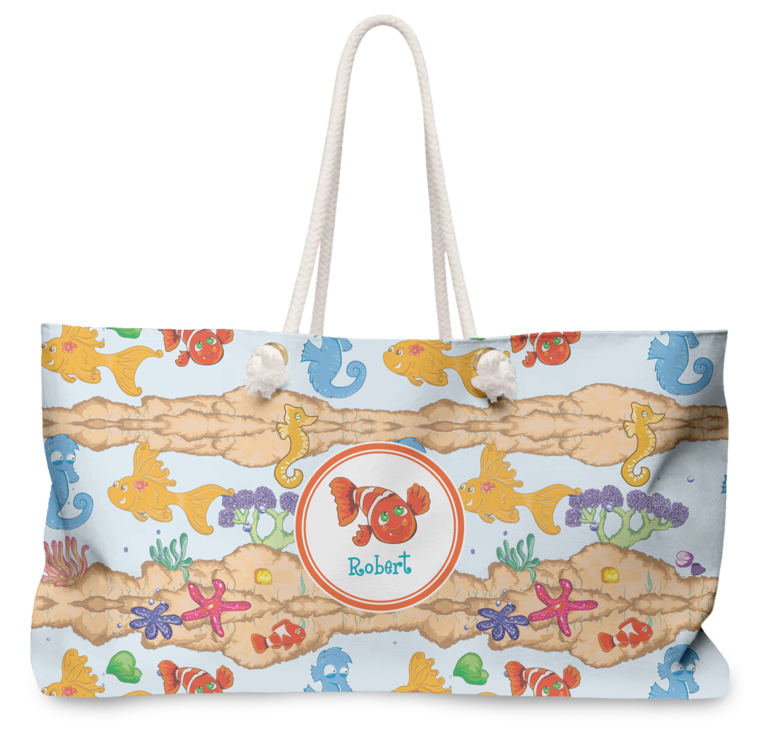 Our oversized weekender tote with rope handles is perfect for your weekend at the beach or on the town. This large tote are 24" W X 13" H, with a 5" gusset and a 27" thick rope handles with a knot that is put through a grommeted brass hole.