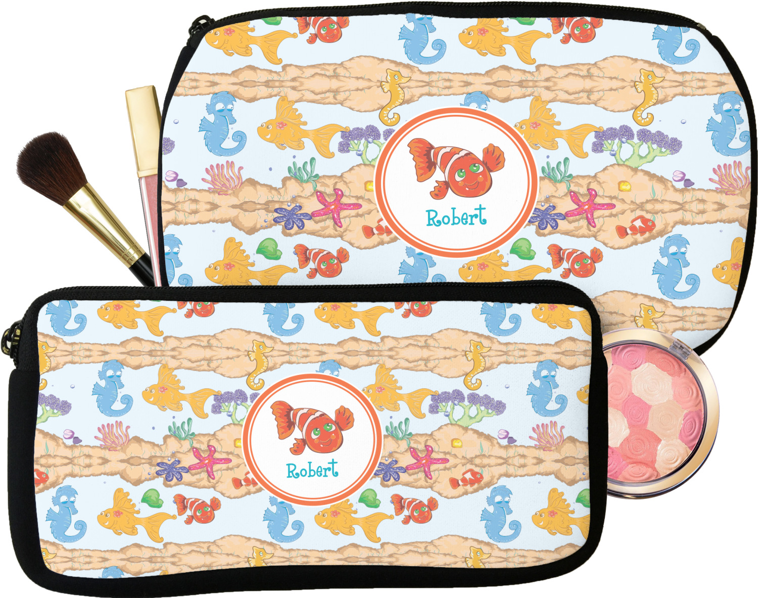 Our personalized makeup bags are available in many different designs, patterns and colors - so you are sure to find one that will love. They are made of neoprene (same material as wet-suits) and thus are water resistant, so spillages in your makeup bag will not end up all over you purse. They are customized on one side and are black on the other side and the zipper is black as well.