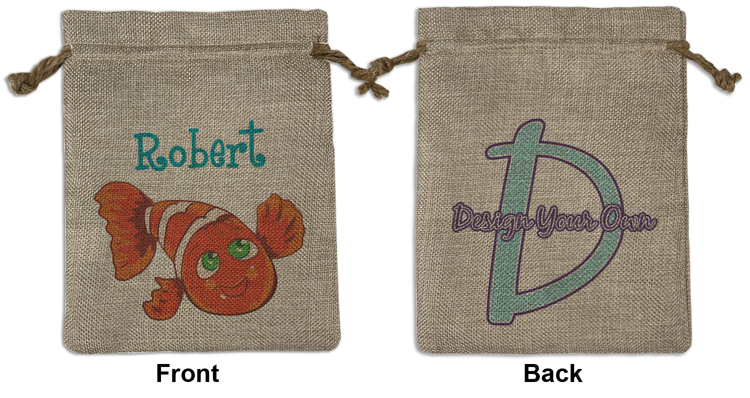 We sell our Burlap Gift Bags in 3 variant sized bags. Made with burlap polyester, each personalized bag can be secured with a twine drawstring pull. Your custom design is available to print on one side or both sides - completely up to you! The sizes of the bags measure approximately 4.5" x 6.5" for the smallest size, 6.5" x 8.0" for the medium size, and 6.5" x 13.5" for the large-sized bag.