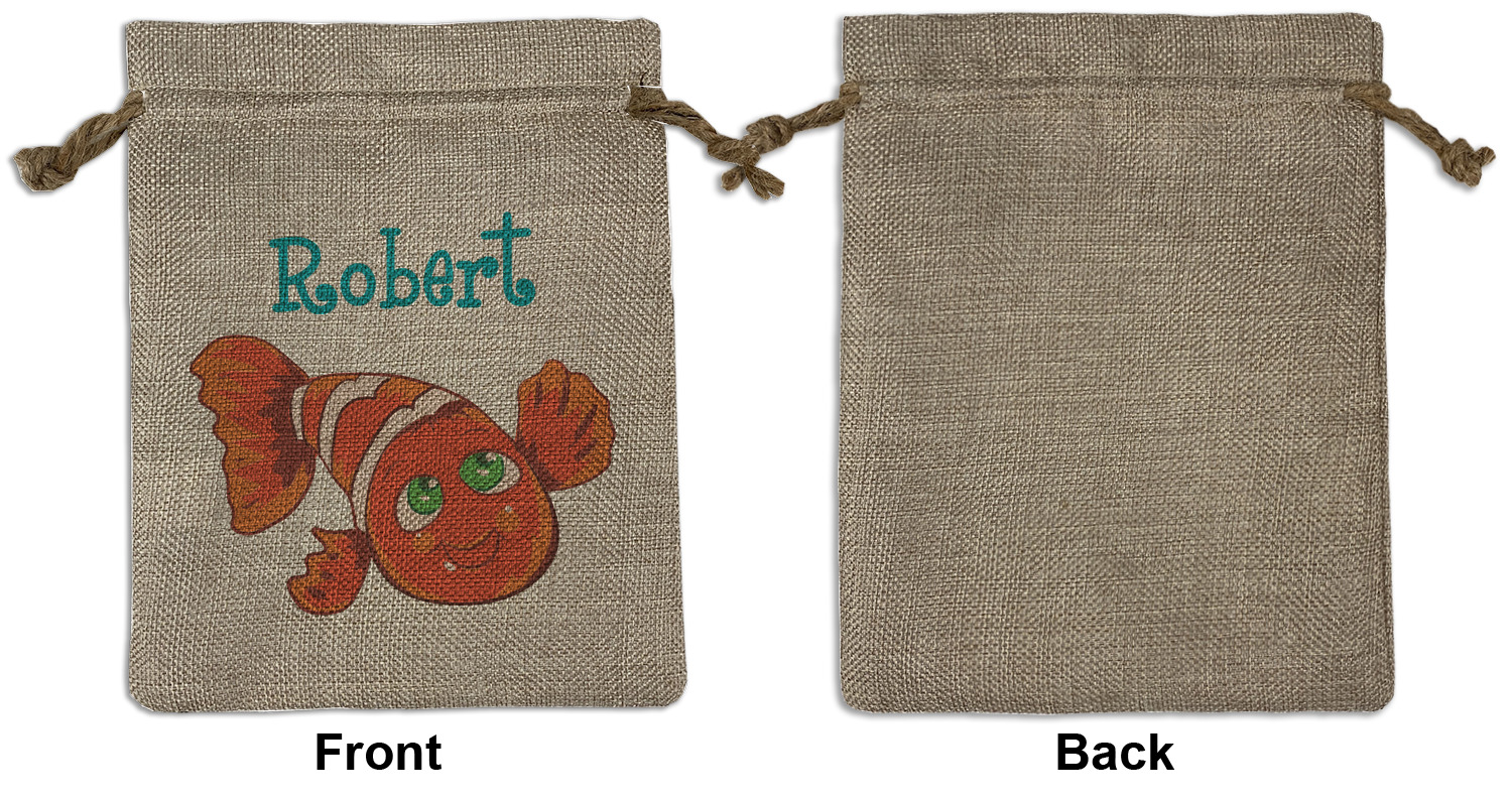 We sell our Burlap Gift Bags in 3 variant sized bags. Made with burlap polyester, each personalized bag can be secured with a twine drawstring pull. Your custom design is available to print on one side or both sides - completely up to you! The sizes of the bags measure approximately 4.5" x 6.5" for the smallest size, 6.5" x 8.0" for the medium size, and 6.5" x 13.5" for the large-sized bag.
