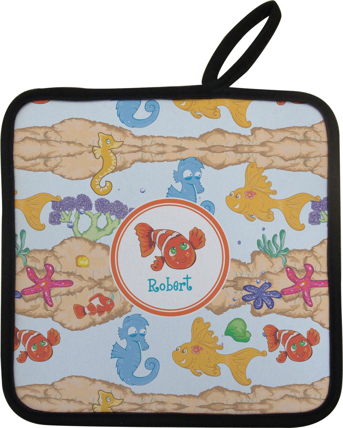 Along with our heat resistant gloves, we also carry personalized pot holders. These pot holders also feature a neoprene front that displays your personalization, and a textured, rubber backing for a sturdy grip. The two materials are connected with a sleek, black trim, and the hot pot holder also includes an attached loop for hanging and storage. You can purchase a kitchen pot holder by itself, or alongside a right or left oven mitt, depending on your needs. The pot holder itself is approximately 8.75 inches by 8.75 inches and 0.25 inches tall.
