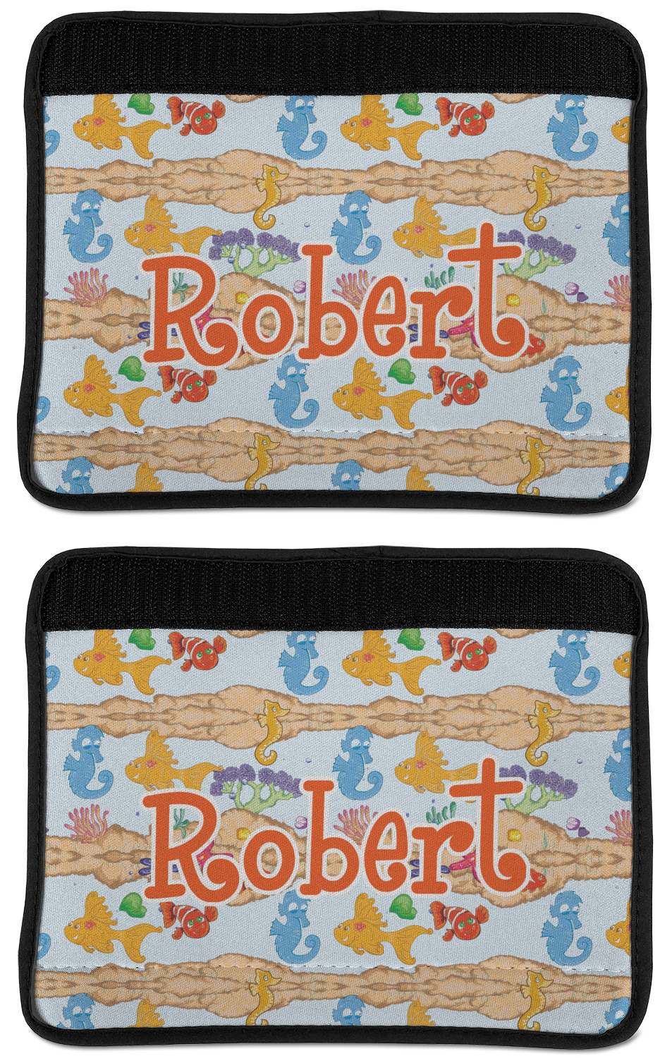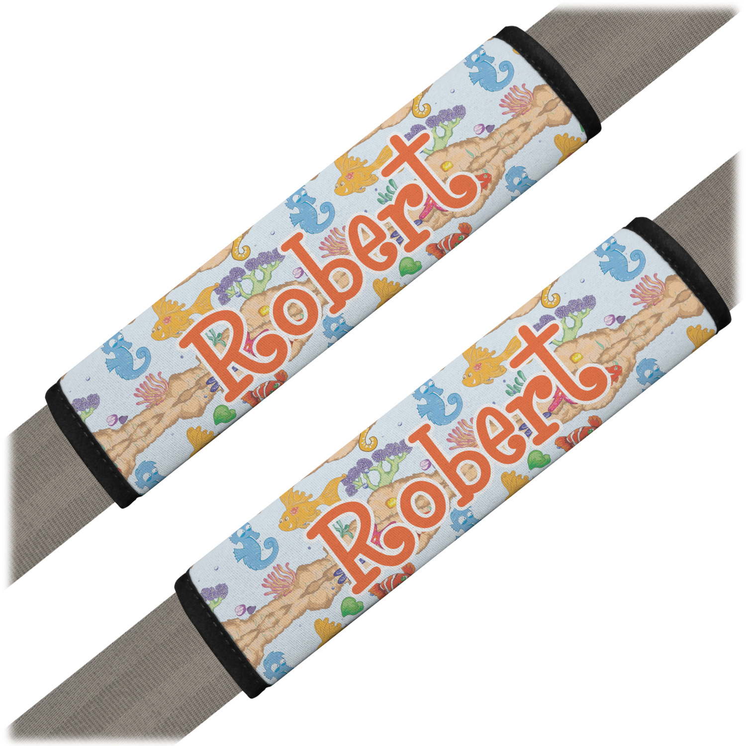 Made from neoprene, our seat belt strap covers wrap around the belt itself and have a Velcro tab for easy attachment and closure. The belt's edges are trimmed with a black polyester for a secure finish. Each cover is 9.5 by 7 inches when open and 9.5 by 2.5 inches when closed. We print your personalized design on the face of the seat belt pad.