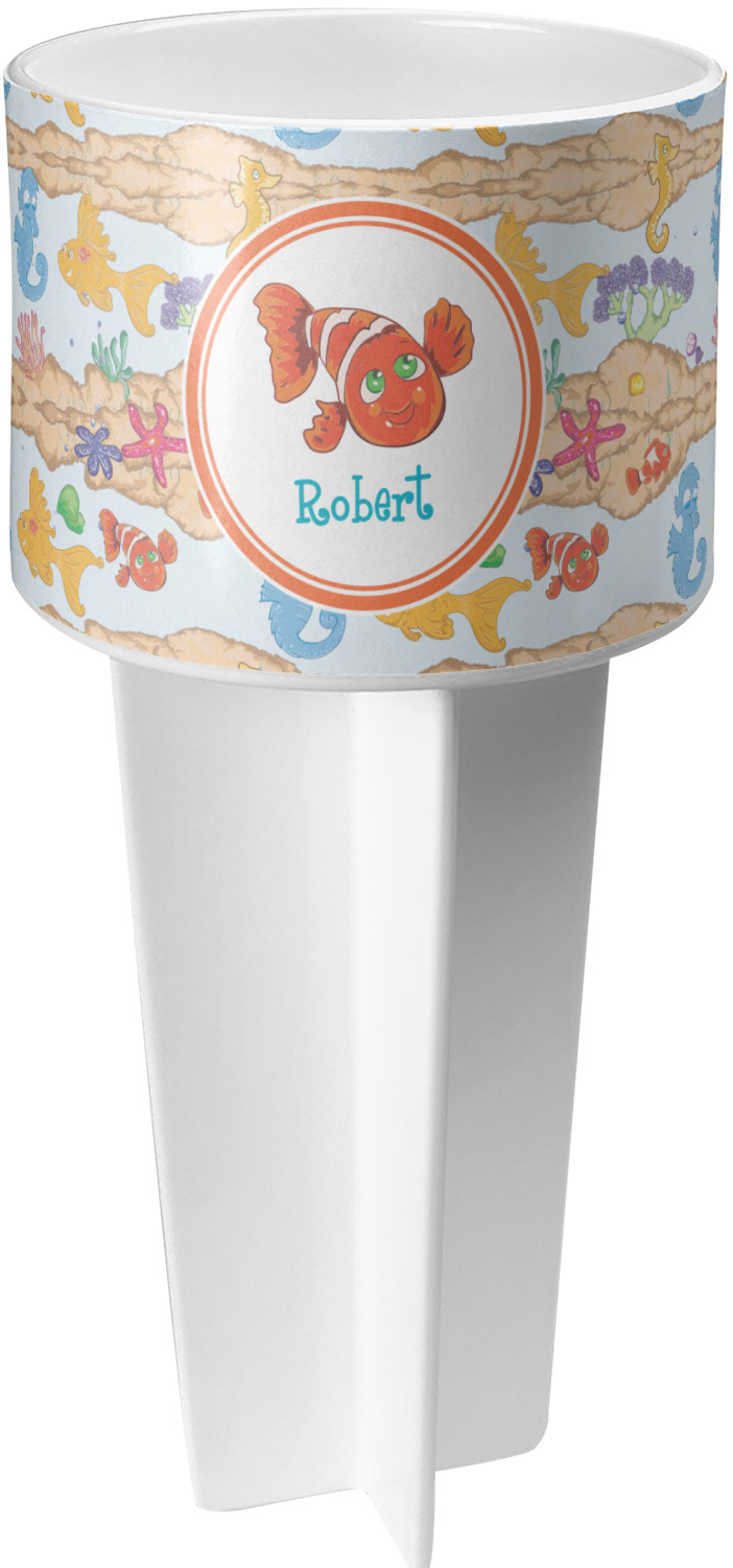 This cup holder has a large stake at its bottom that anchors it to the sand or ground below, while the cup holder rests above the stake. The entire drink holder is made of durable plastic and displays your customization around the cup holder portion. We sell these personalized beach spikers in two different colors: black and white.