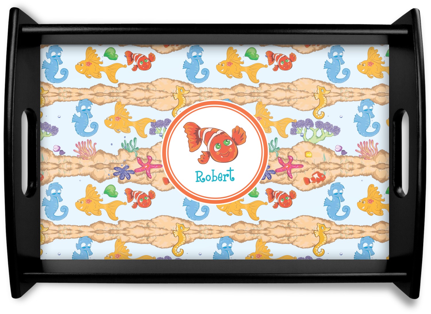 This serving tray with handles features square edges and two rounded sides, creating a very modern look. Each side is fabricated from a beautifully cut, natural wood. The bottom of the interior of the tray displays your customized design in bright, vibrant color. The tray is sold in both a black color and a natural wood look. Each variation of the wood serving tray has two sizes: Small, which is 14" x 10" x 2.25", and Large, which is 19.5" x 13.5" x 2.75".
