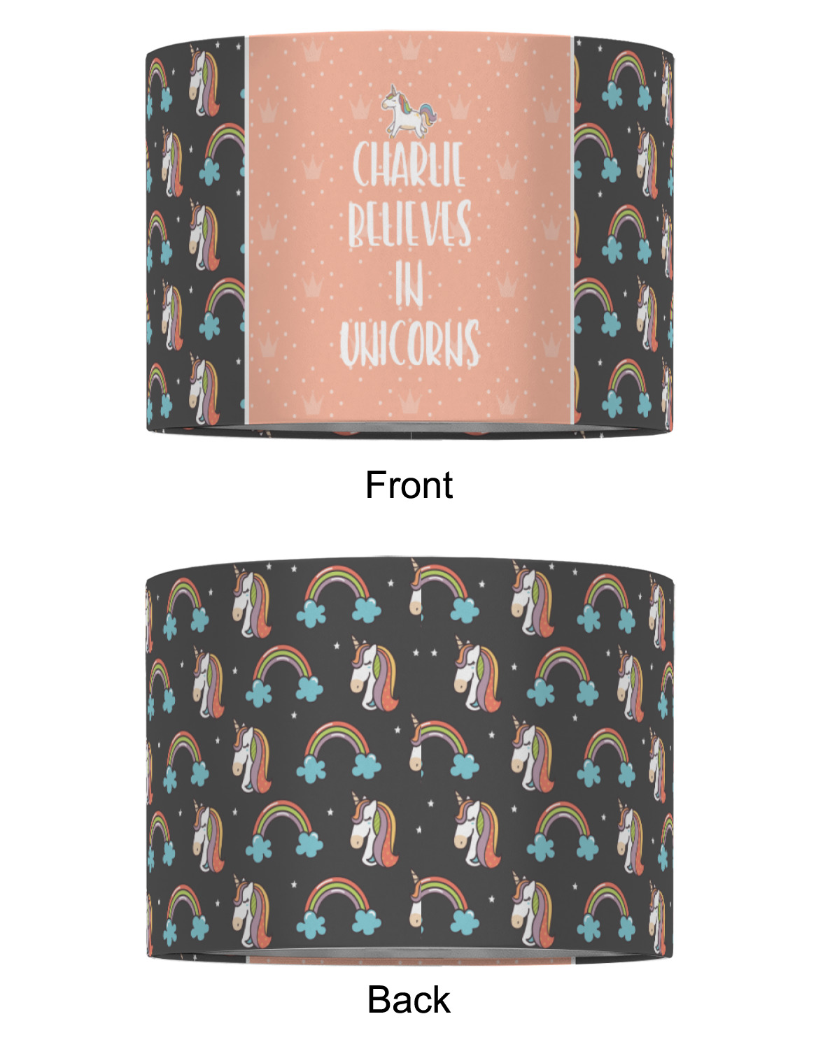 This fun unicorn design has a dark grey background with brightly colored unicorns and rainbows all across it.This pattern is on either side of a peach background with subtle crowns on it. Front and center is a fun saying that says "Charlie Believes In Unicorns" where "Charlie" can be replaced with your name. On the top of this text is a majestic leaping unicorn.
