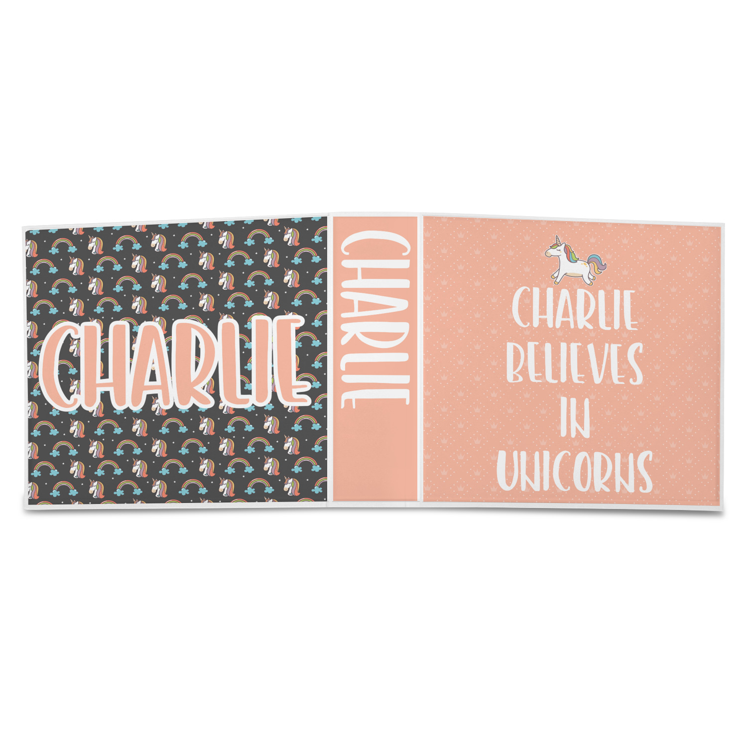 This fun unicorn design has a dark grey background with brightly colored unicorns and rainbows all across it.This pattern is on either side of a peach background with subtle crowns on it. Front and center is a fun saying that says "Charlie Believes In Unicorns" where "Charlie" can be replaced with your name. On the top of this text is a majestic leaping unicorn.