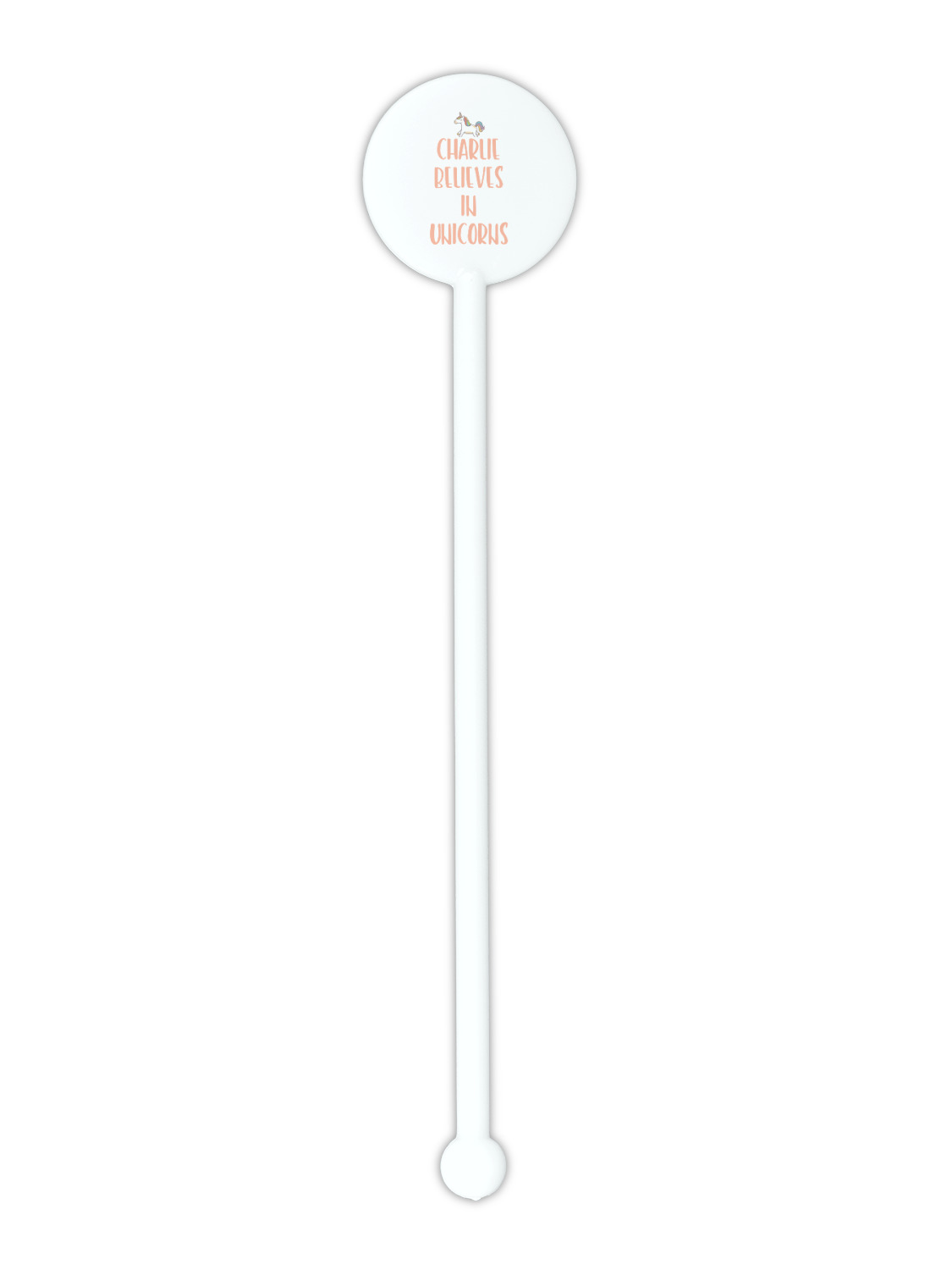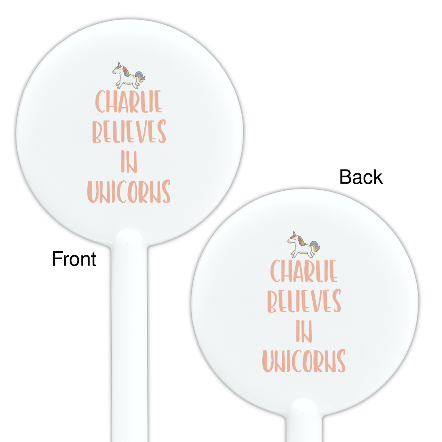 This fun unicorn design has a dark grey background with brightly colored unicorns and rainbows all across it.This pattern is on either side of a peach background with subtle crowns on it. Front and center is a fun saying that says "Charlie Believes In Unicorns" where "Charlie" can be replaced with your name. On the top of this text is a majestic leaping unicorn.