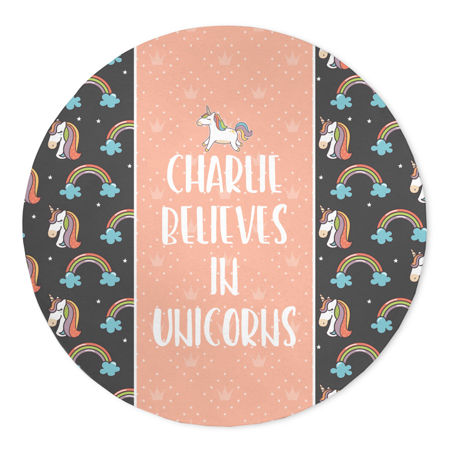 This fun unicorn design has a dark grey background with brightly colored unicorns and rainbows all across it.This pattern is on either side of a peach background with subtle crowns on it. Front and center is a fun saying that says "Charlie Believes In Unicorns" where "Charlie" can be replaced with your name. On the top of this text is a majestic leaping unicorn.