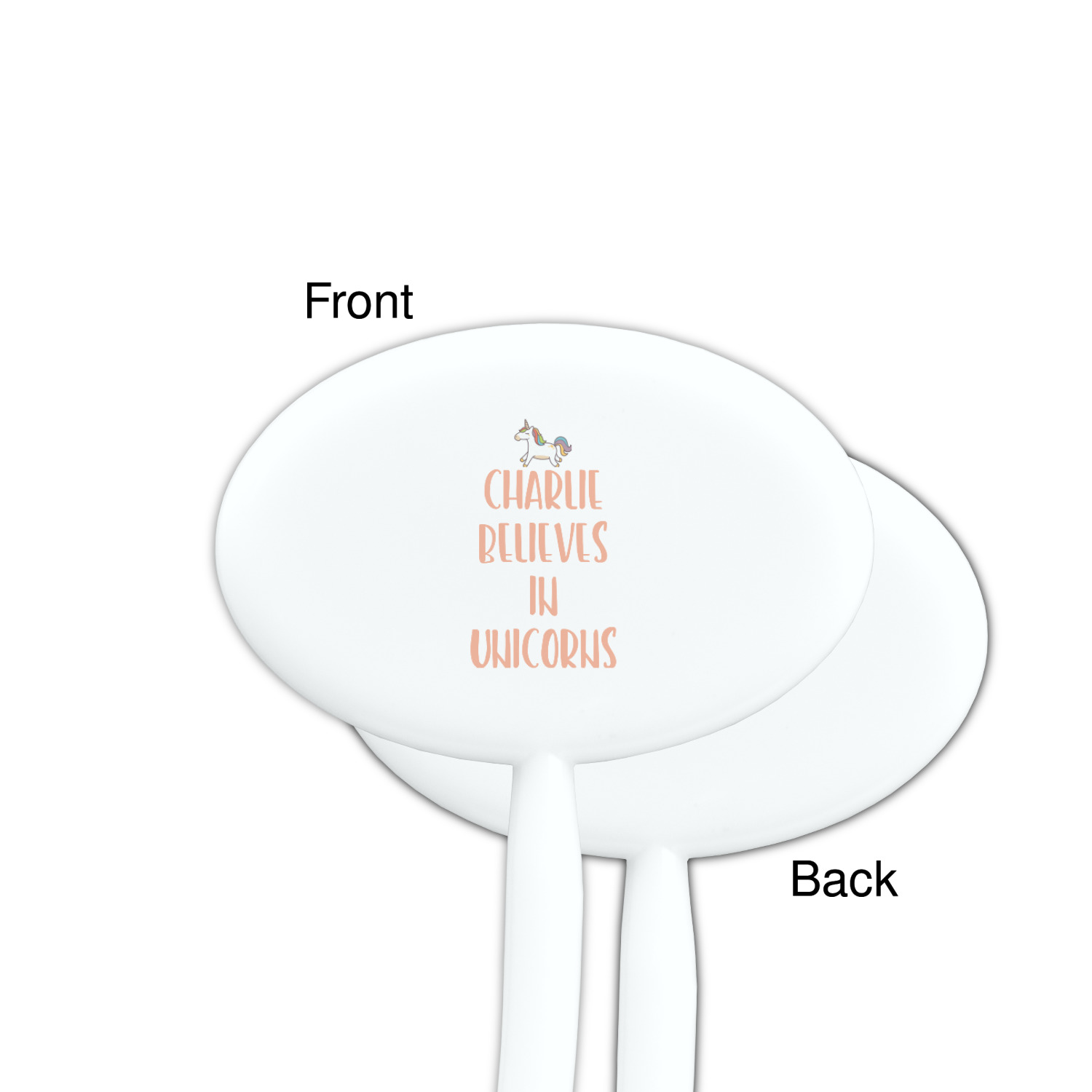 This fun unicorn design has a dark grey background with brightly colored unicorns and rainbows all across it.This pattern is on either side of a peach background with subtle crowns on it. Front and center is a fun saying that says "Charlie Believes In Unicorns" where "Charlie" can be replaced with your name. On the top of this text is a majestic leaping unicorn.