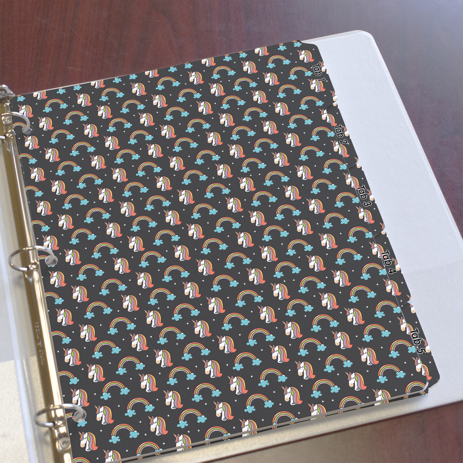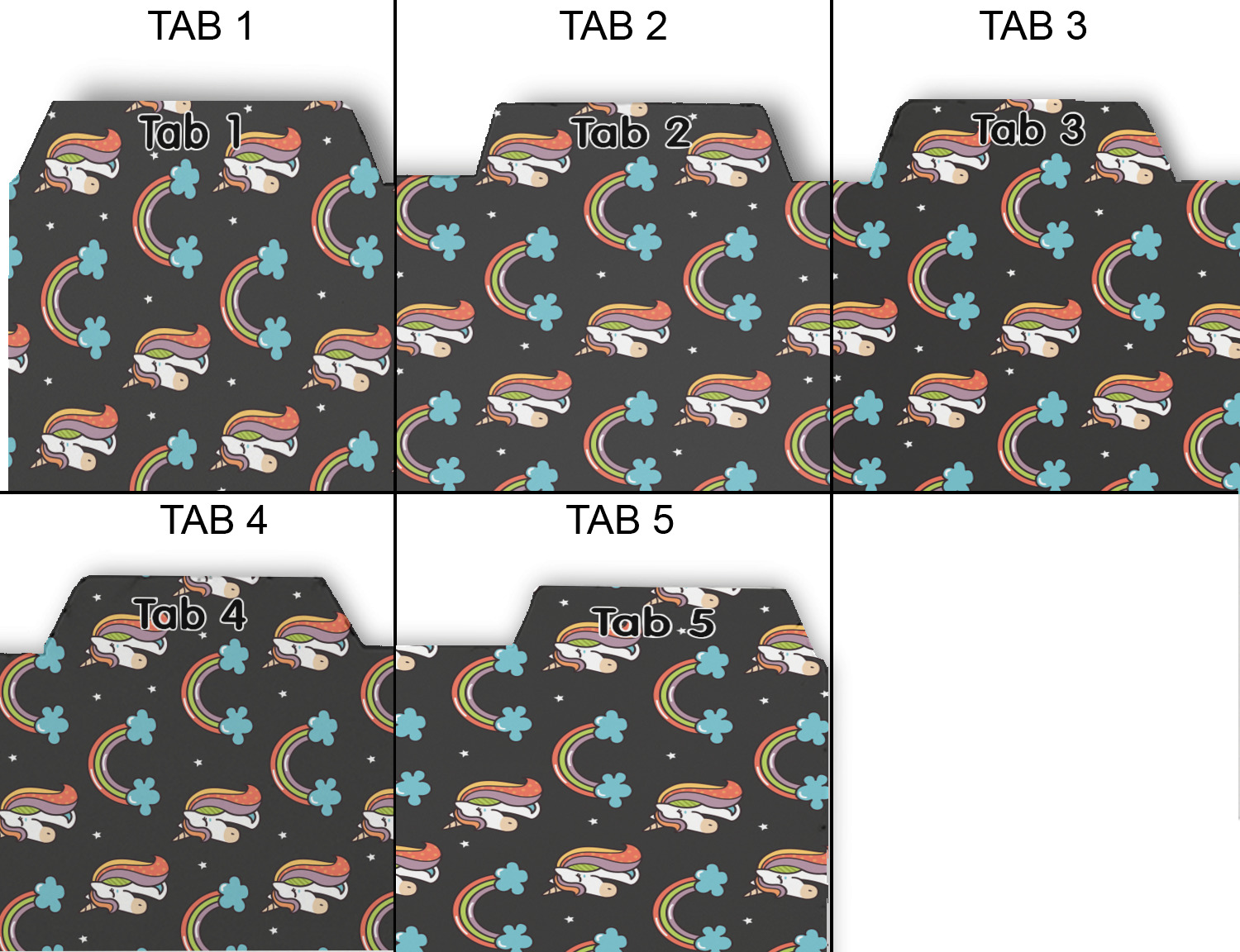Whether you use binders at school or at work, we have designs to suit all of them. Available in 5 or 6 tab sets, you are sure to find a set to suit your needs. The back of each one is white and can be used to take notes, write vital information on, etc.