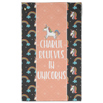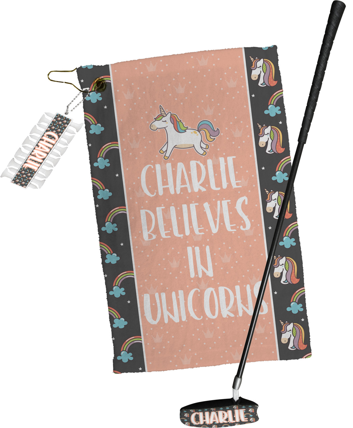 This fun unicorn design has a dark grey background with brightly colored unicorns and rainbows all across it.This pattern is on either side of a peach background with subtle crowns on it. Front and center is a fun saying that says "Charlie Believes In Unicorns" where "Charlie" can be replaced with your name. On the top of this text is a majestic leaping unicorn.