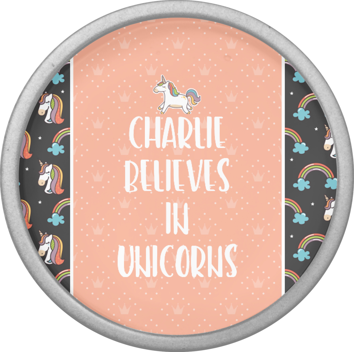 This fun unicorn design has a dark grey background with brightly colored unicorns and rainbows all across it.This pattern is on either side of a peach background with subtle crowns on it. Front and center is a fun saying that says "Charlie Believes In Unicorns" where "Charlie" can be replaced with your name. On the top of this text is a majestic leaping unicorn.
