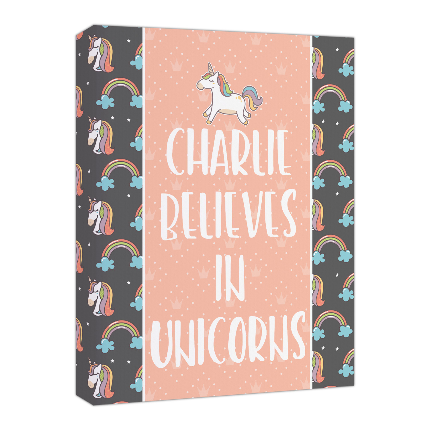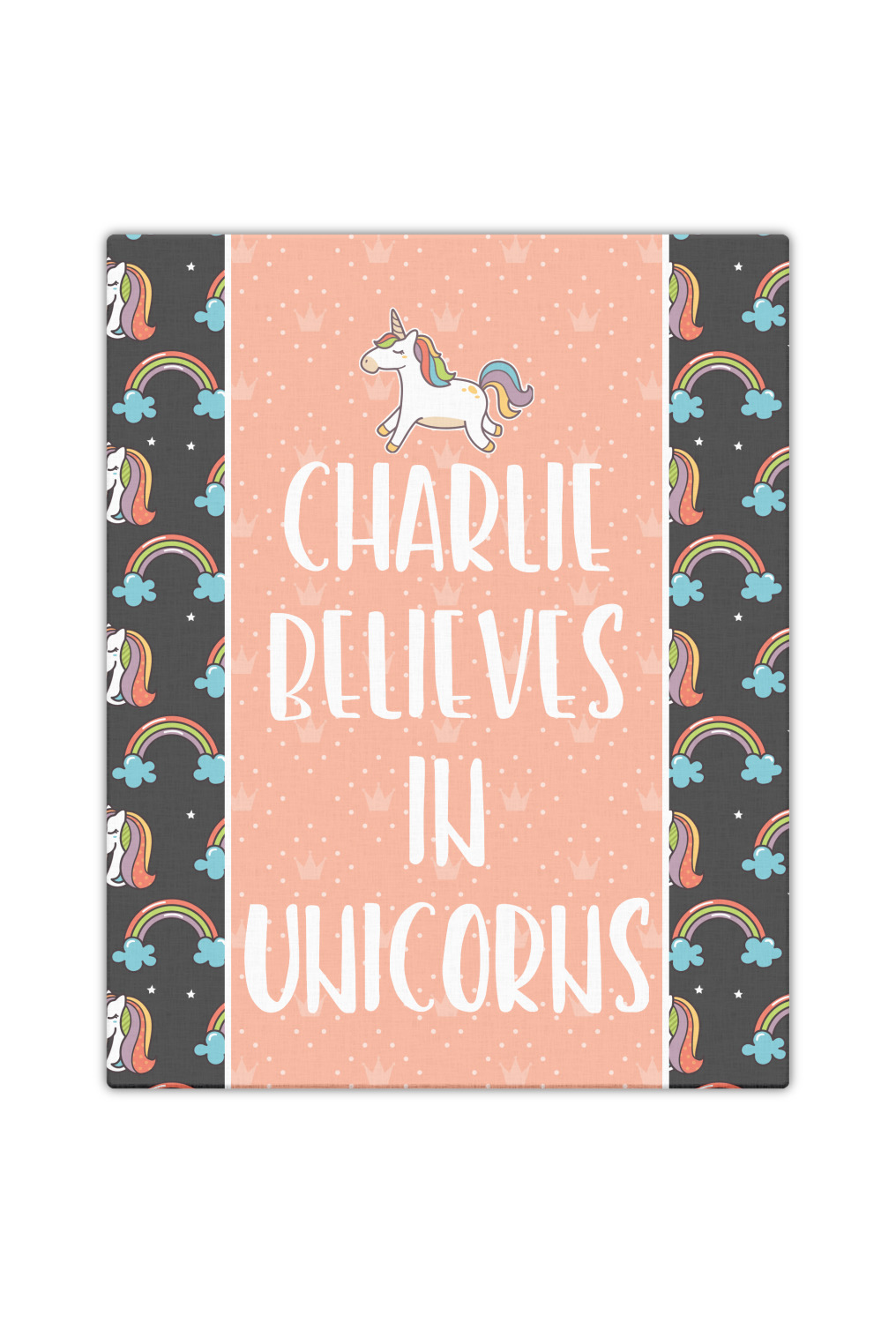 This fun unicorn design has a dark grey background with brightly colored unicorns and rainbows all across it.This pattern is on either side of a peach background with subtle crowns on it. Front and center is a fun saying that says "Charlie Believes In Unicorns" where "Charlie" can be replaced with your name. On the top of this text is a majestic leaping unicorn.