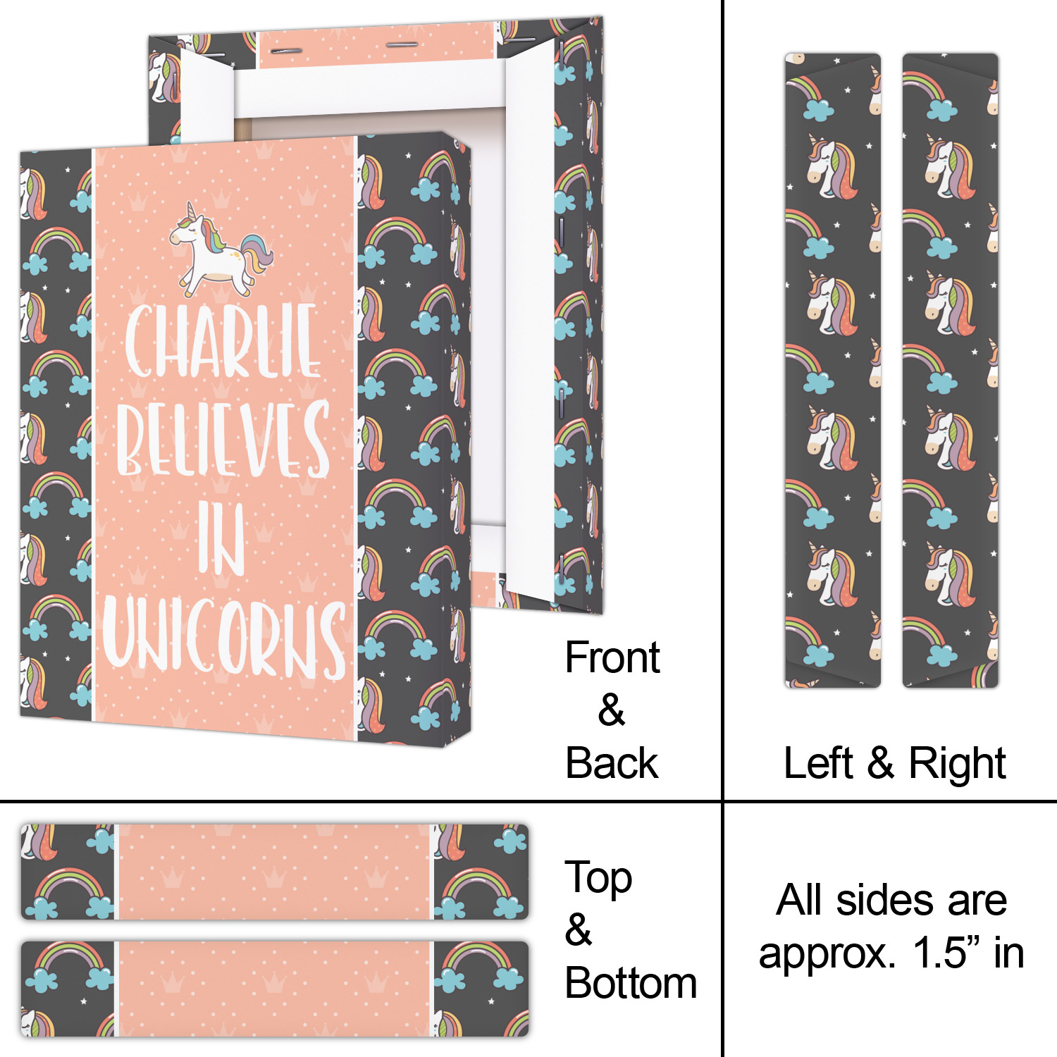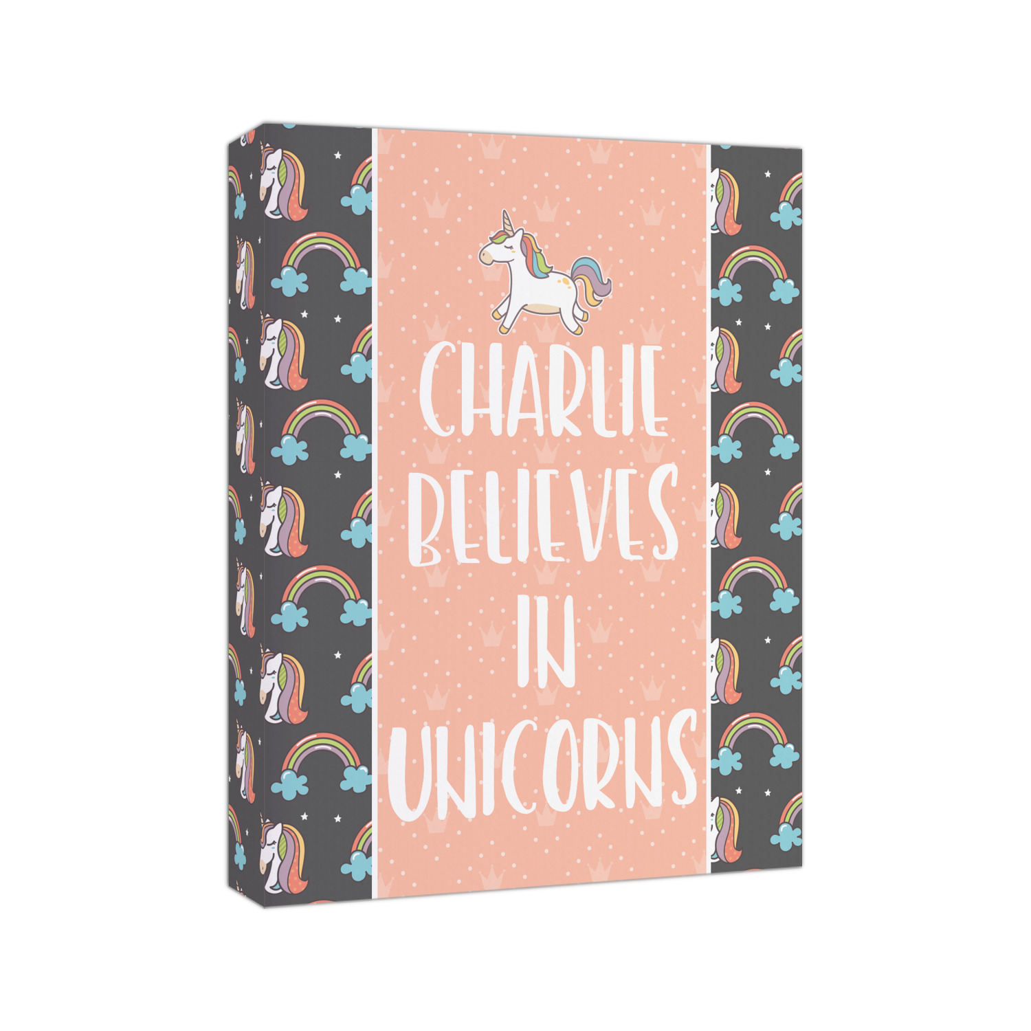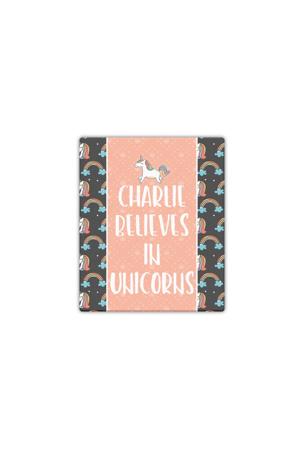 This fun unicorn design has a dark grey background with brightly colored unicorns and rainbows all across it.This pattern is on either side of a peach background with subtle crowns on it. Front and center is a fun saying that says "Charlie Believes In Unicorns" where "Charlie" can be replaced with your name. On the top of this text is a majestic leaping unicorn.