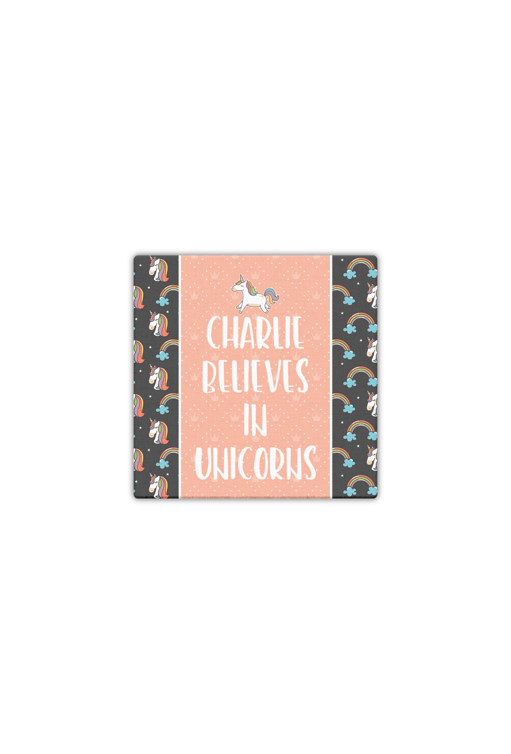 This fun unicorn design has a dark grey background with brightly colored unicorns and rainbows all across it.This pattern is on either side of a peach background with subtle crowns on it. Front and center is a fun saying that says "Charlie Believes In Unicorns" where "Charlie" can be replaced with your name. On the top of this text is a majestic leaping unicorn.