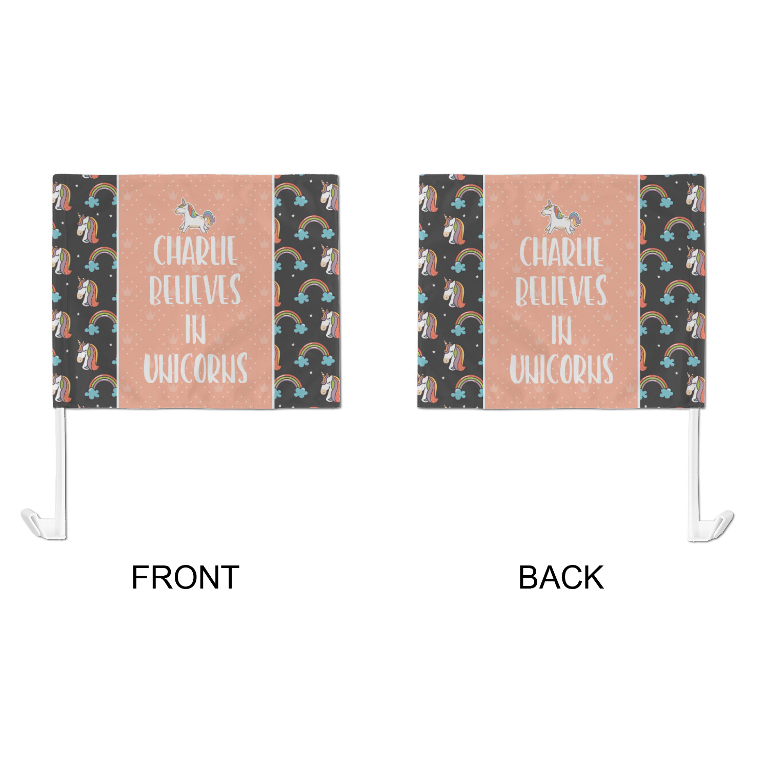 Our personalized flags are made from a durable, yet lightweight cloth that will proudly bear your logo or design of choice, while withstanding the outside elements. We have two size options - 8" x 11" and 11" x 15". Both come with a flag pole which includes a clip that secures the pole to the side window, whether it is rolled up or down. The flags are printed on both sides to display your design from all directions.