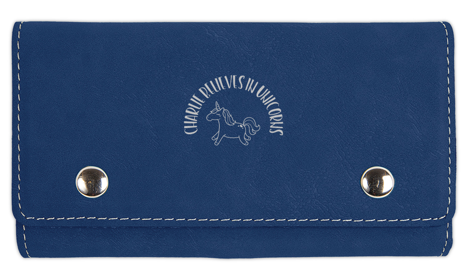 This fun unicorn design has a dark grey background with brightly colored unicorns and rainbows all across it.This pattern is on either side of a peach background with subtle crowns on it. Front and center is a fun saying that says "Charlie Believes In Unicorns" where "Charlie" can be replaced with your name. On the top of this text is a majestic leaping unicorn.