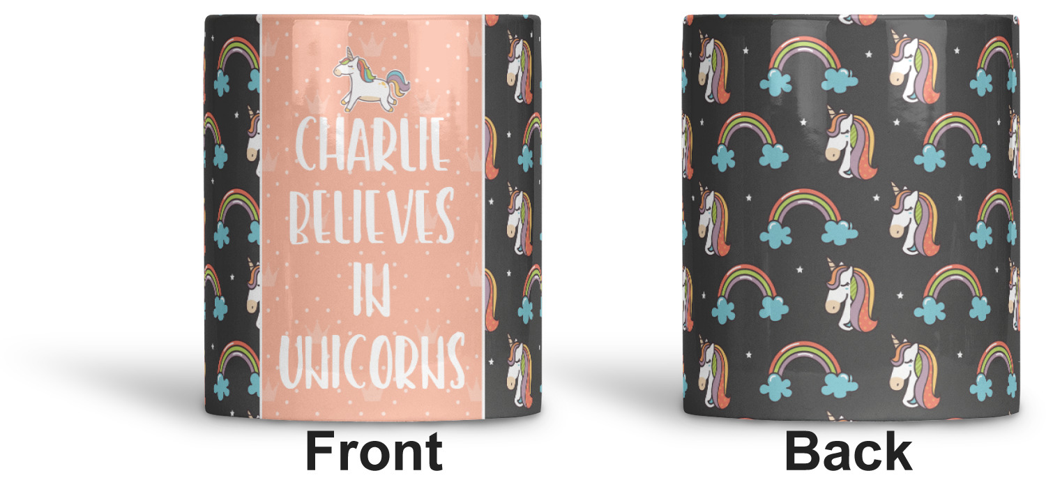 This fun unicorn design has a dark grey background with brightly colored unicorns and rainbows all across it.This pattern is on either side of a peach background with subtle crowns on it. Front and center is a fun saying that says "Charlie Believes In Unicorns" where "Charlie" can be replaced with your name. On the top of this text is a majestic leaping unicorn.