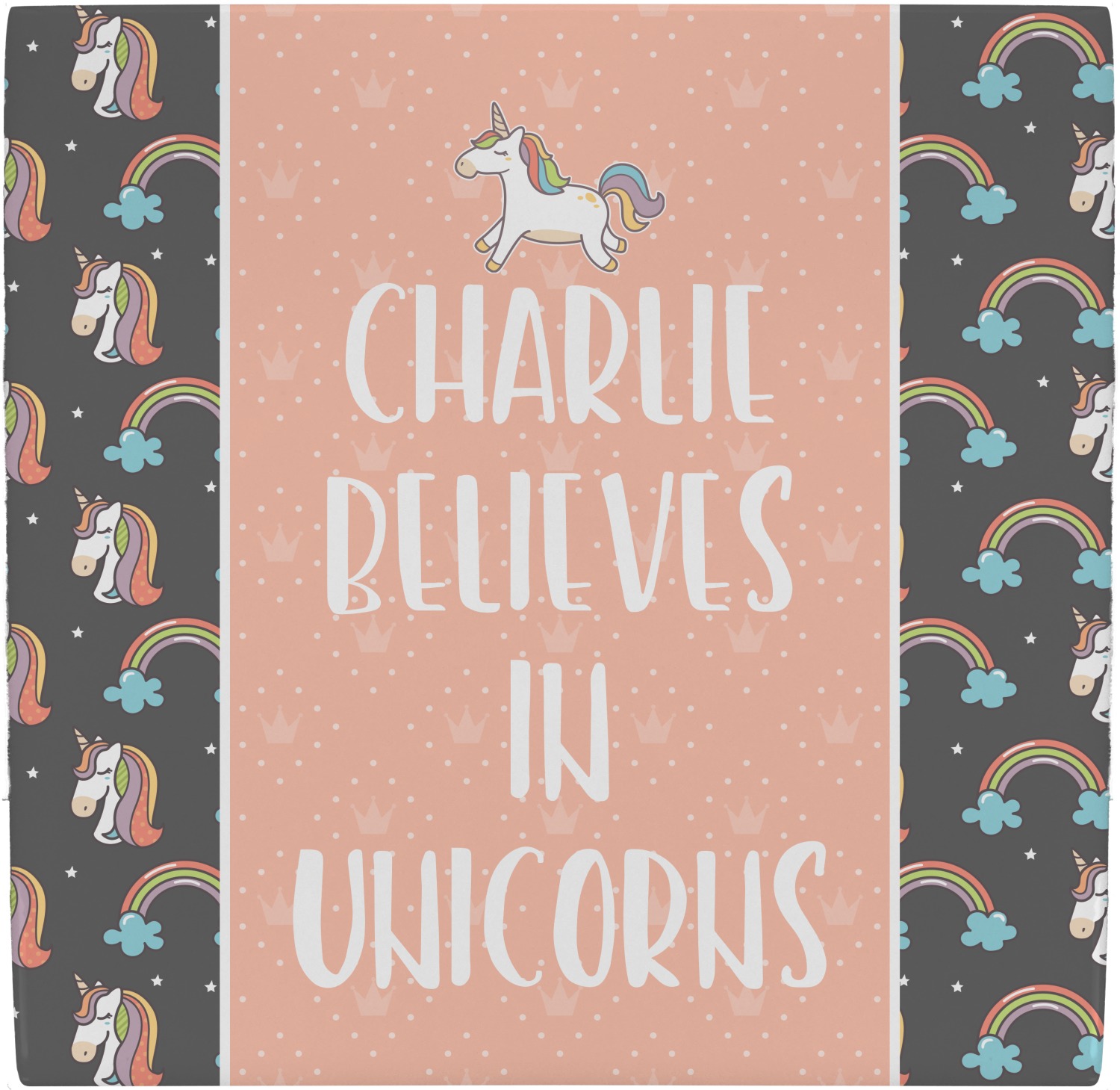 This fun unicorn design has a dark grey background with brightly colored unicorns and rainbows all across it.This pattern is on either side of a peach background with subtle crowns on it. Front and center is a fun saying that says "Charlie Believes In Unicorns" where "Charlie" can be replaced with your name. On the top of this text is a majestic leaping unicorn.
