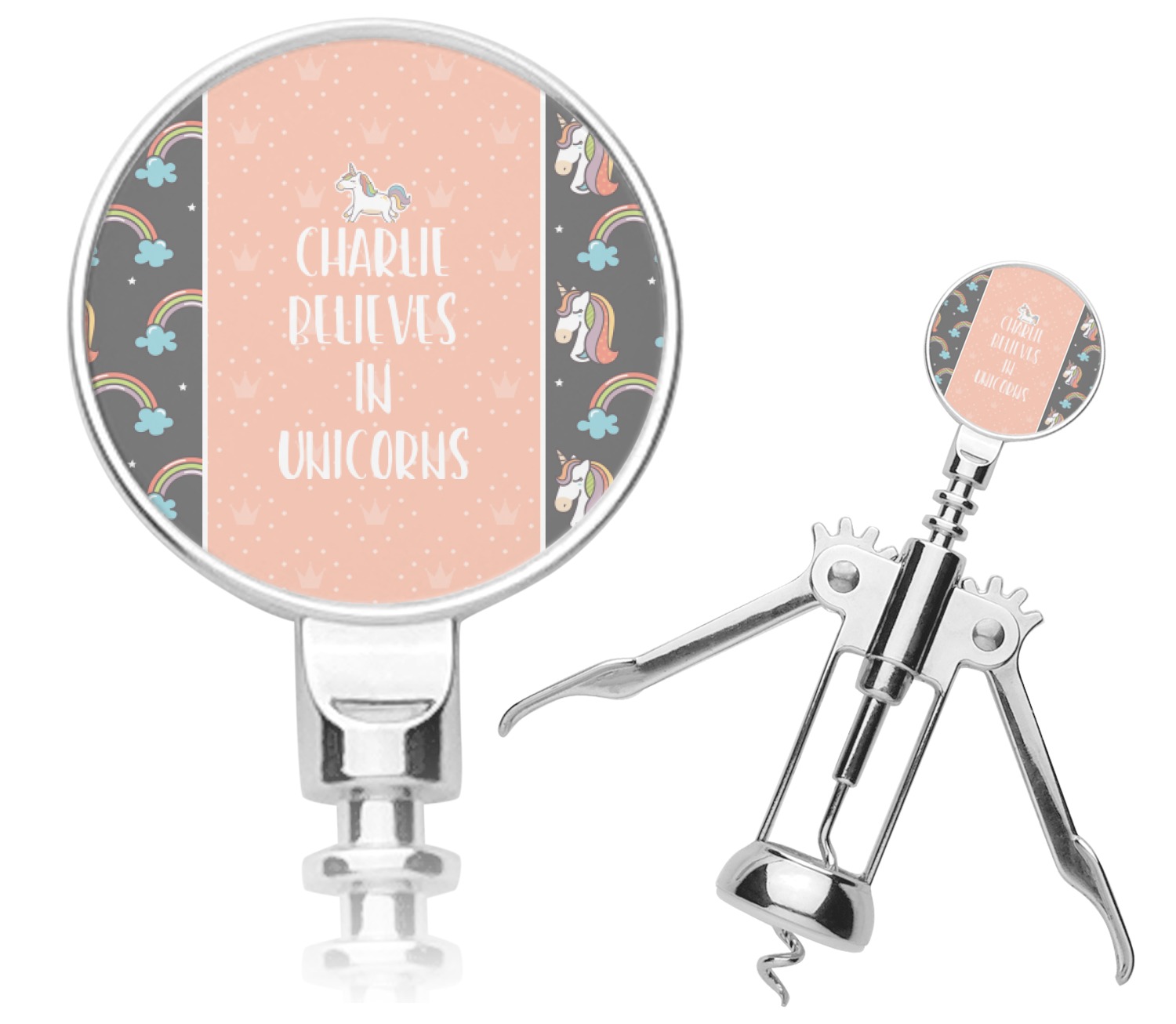 This fun unicorn design has a dark grey background with brightly colored unicorns and rainbows all across it.This pattern is on either side of a peach background with subtle crowns on it. Front and center is a fun saying that says "Charlie Believes In Unicorns" where "Charlie" can be replaced with your name. On the top of this text is a majestic leaping unicorn.