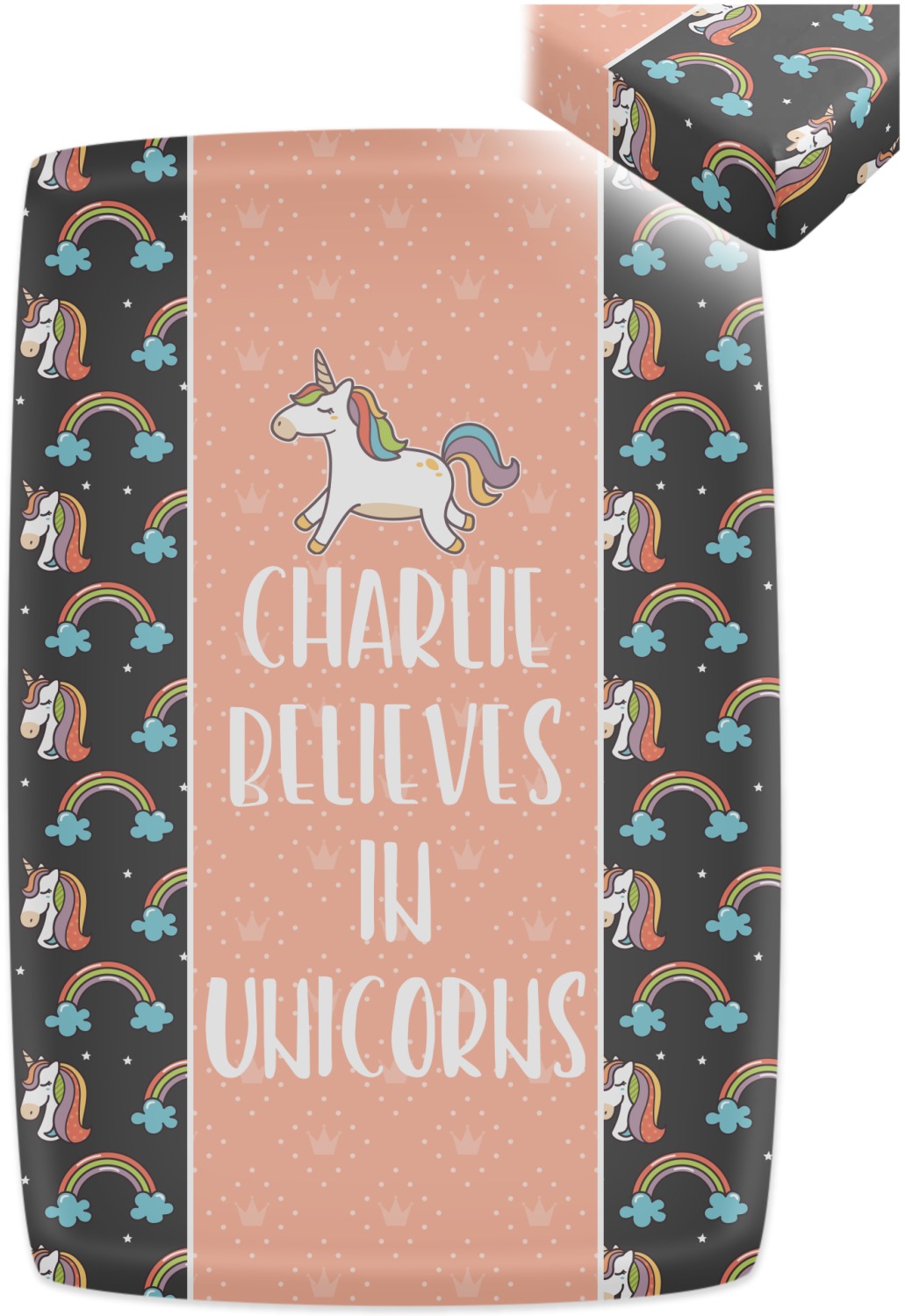 This fun unicorn design has a dark grey background with brightly colored unicorns and rainbows all across it.This pattern is on either side of a peach background with subtle crowns on it. Front and center is a fun saying that says "Charlie Believes In Unicorns" where "Charlie" can be replaced with your name. On the top of this text is a majestic leaping unicorn.
