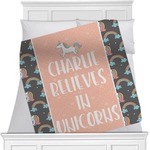 This fun unicorn design has a dark grey background with brightly colored unicorns and rainbows all across it.This pattern is on either side of a peach background with subtle crowns on it. Front and center is a fun saying that says "Charlie Believes In Unicorns" where "Charlie" can be replaced with your name. On the top of this text is a majestic leaping unicorn.