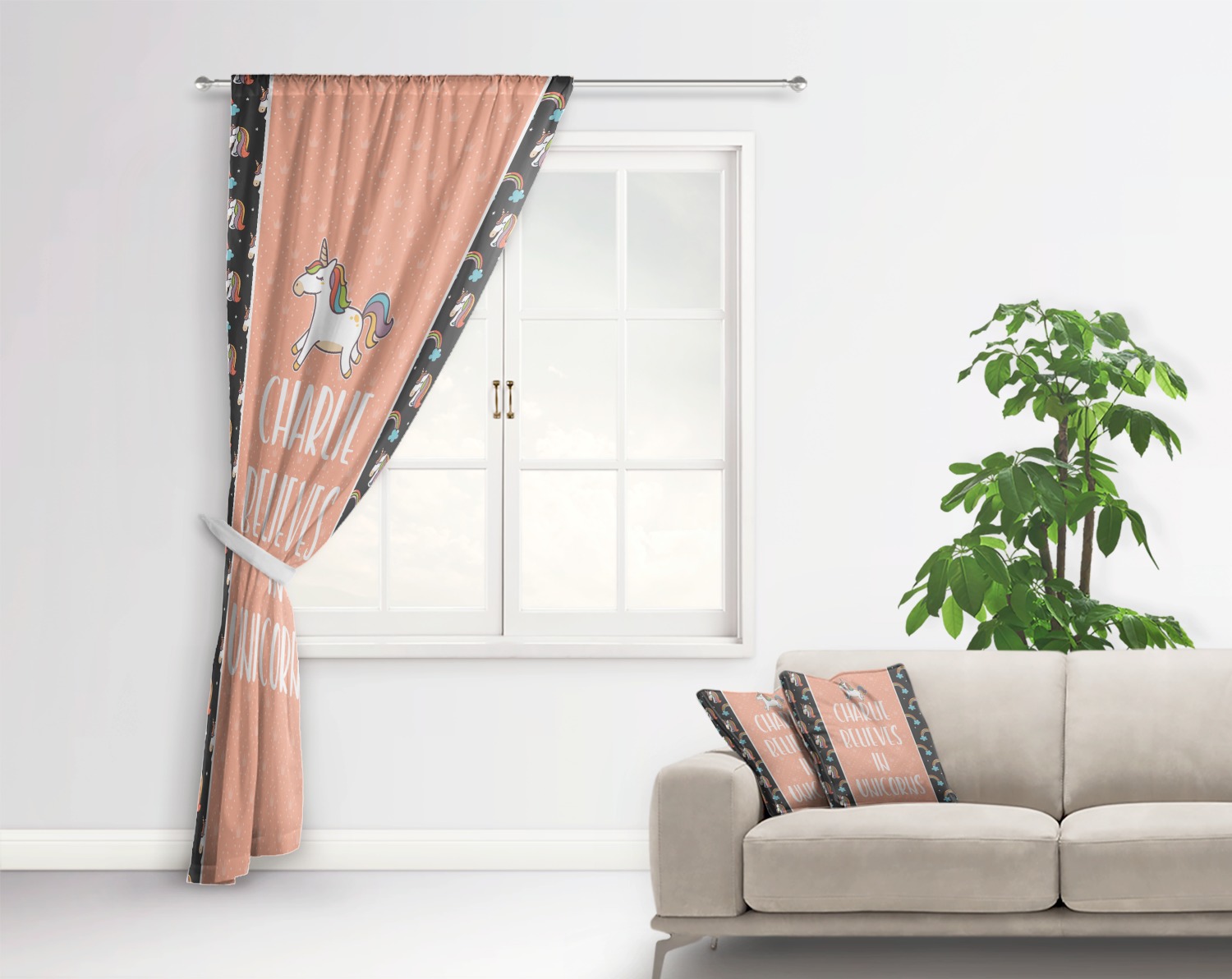 This fun unicorn design has a dark grey background with brightly colored unicorns and rainbows all across it.This pattern is on either side of a peach background with subtle crowns on it. Front and center is a fun saying that says "Charlie Believes In Unicorns" where "Charlie" can be replaced with your name. On the top of this text is a majestic leaping unicorn.