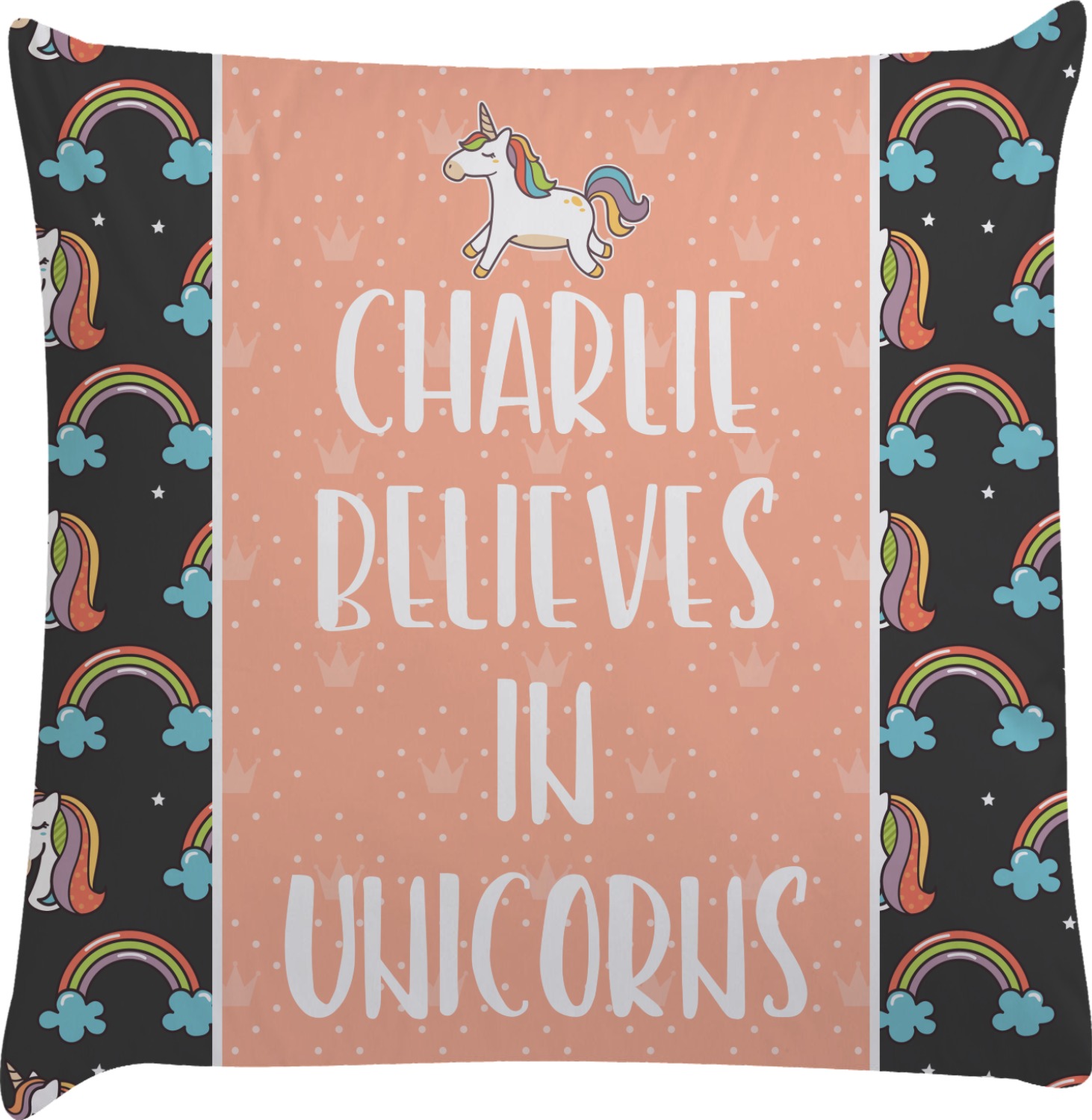 This fun unicorn design has a dark grey background with brightly colored unicorns and rainbows all across it.This pattern is on either side of a peach background with subtle crowns on it. Front and center is a fun saying that says "Charlie Believes In Unicorns" where "Charlie" can be replaced with your name. On the top of this text is a majestic leaping unicorn.